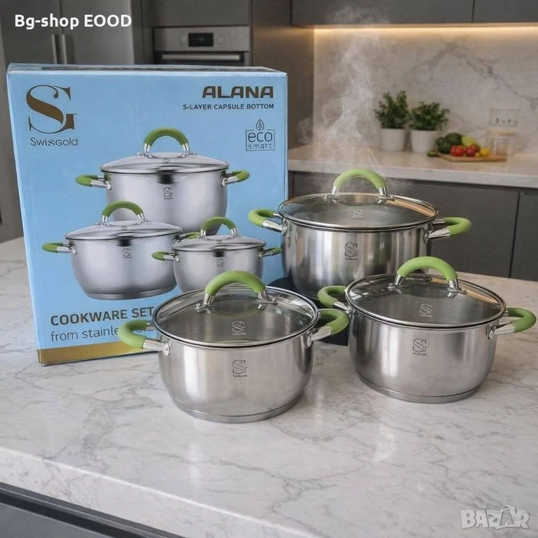 Комплект тенджери Swissgold Alana – практично и стилно решение за всяка кухня. Изработени от висококачествена неръждаема стомана с 5-слойно капсулно дъно за равномерно готвене и запазване на вкуса на храната.