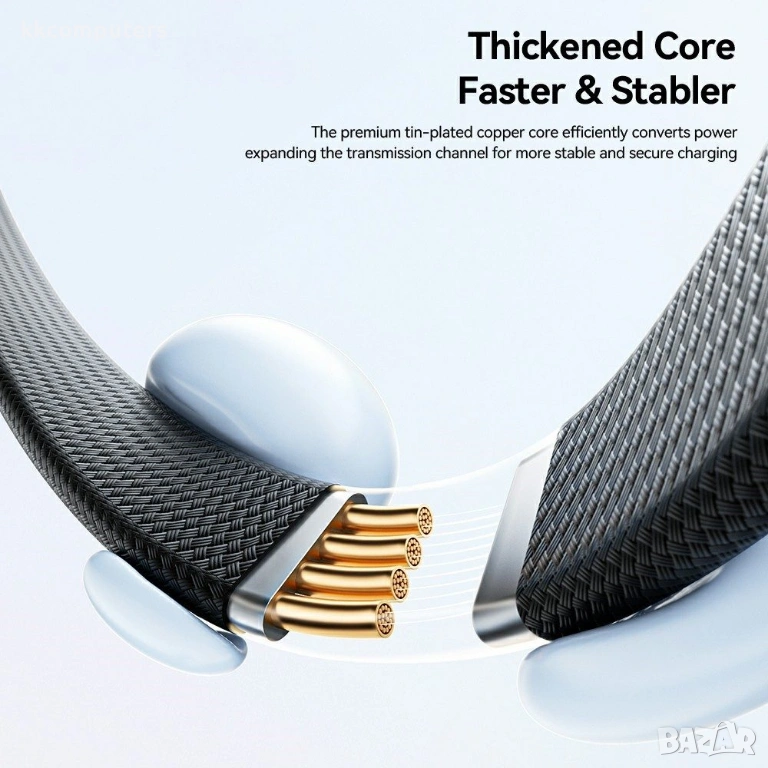 Интелигентният чип автоматично разпознава необходимото напрежение и ток за свързаното устройство, като подпомага безопасното и ефективно зареждане. Удебеленото калайдисано медно жило осигурява по-добра проводимост и по-стабилна работа.