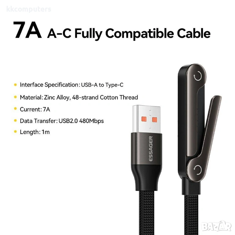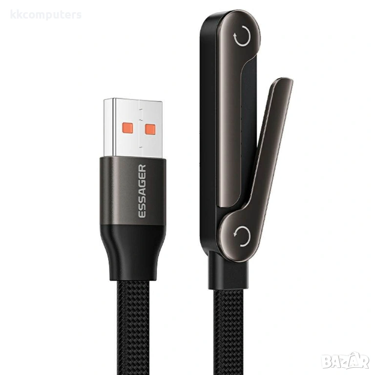 ESSAGER USB-A към Type-C L-Shape кабел е създаден за бързо зареждане и удобно използване на телефона по време на игра, гледане на видео и ежедневна работа. Моделът поддържа до 7A ток и максимална мощност до 100W при използване със съвместимо високoмощно зарядно устройство.
