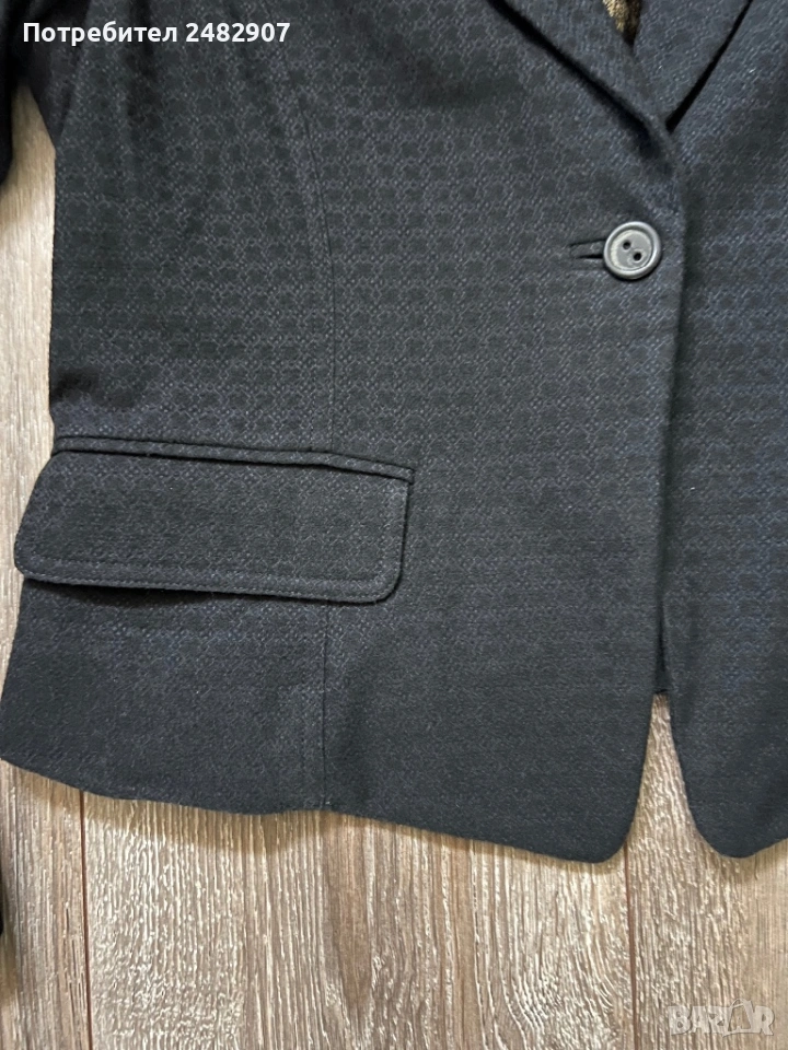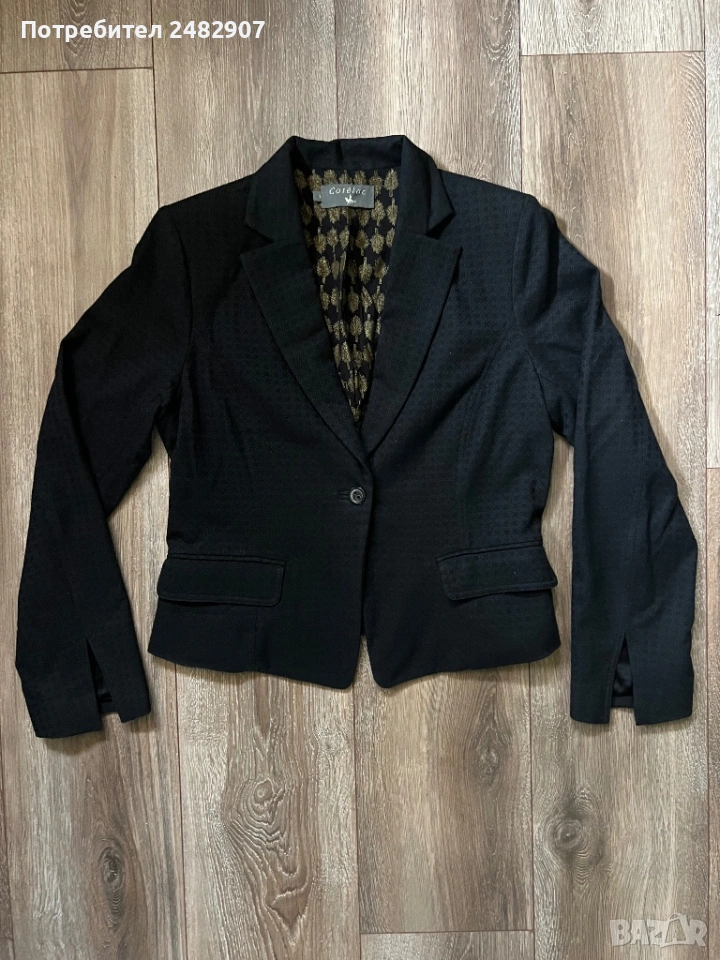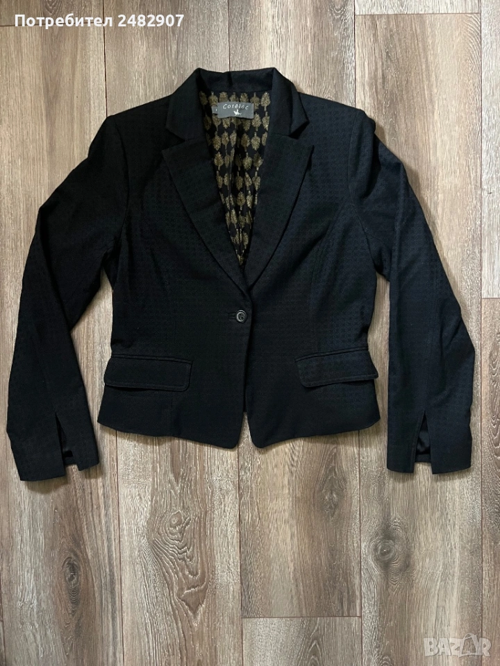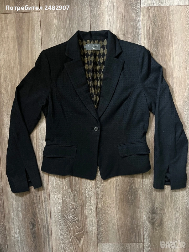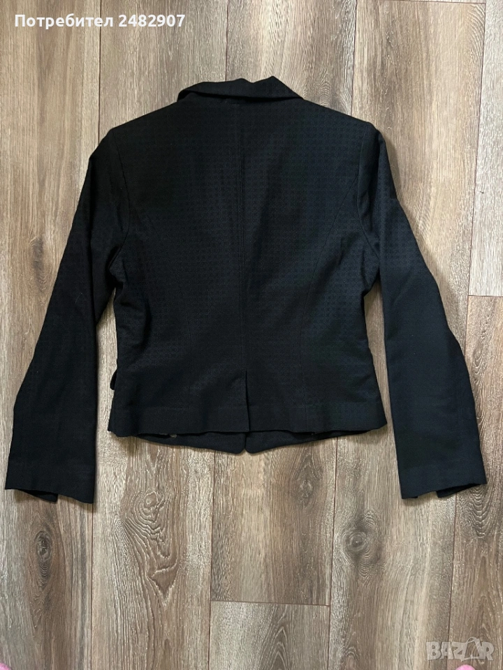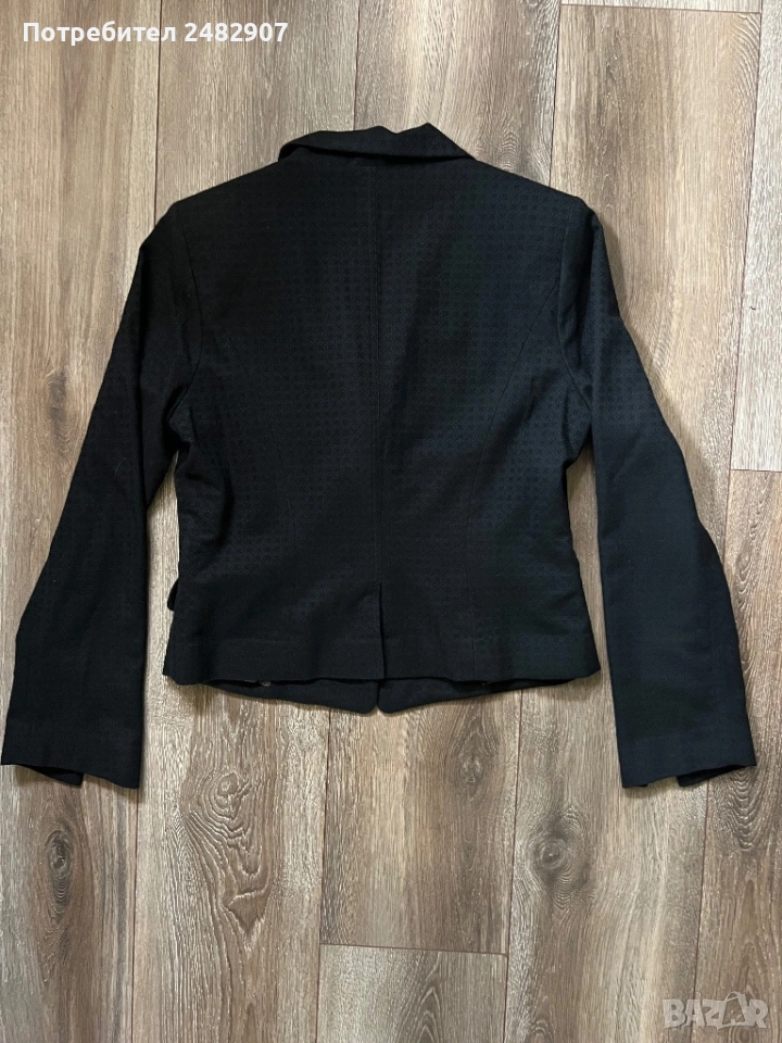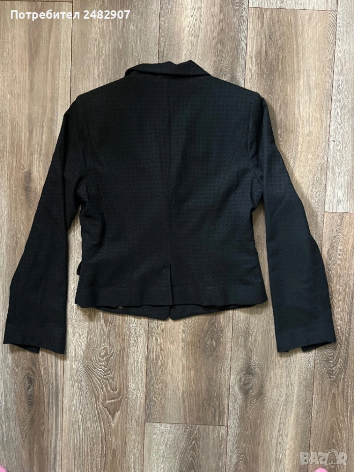 Черно късо дамско сако с подплата и подплънки на раменете, размер S. Ширина в раменете - 38 см, ширина под мишниците - 46 см, ширина в долната част - 45 см, дължина от рамото до долу - 53 см, дължина на ръкава от рамото - 59 см, ширина на ръкава в долната част - 14 см. Много запазено, обличано веднъж за повод, с цепки на ръкавите и на гърба, с два джоба отпред и закопчаване с едно копче. Много стилно и изключително висококачествено изработено.
