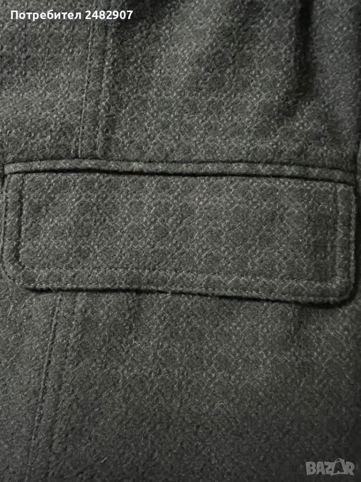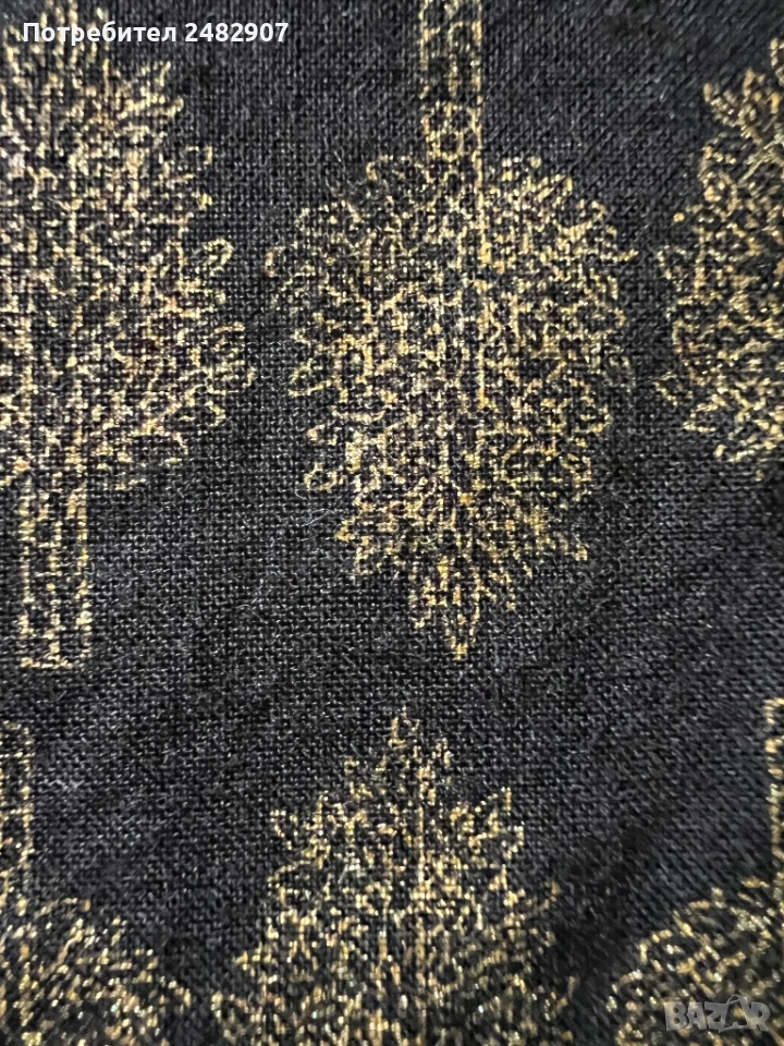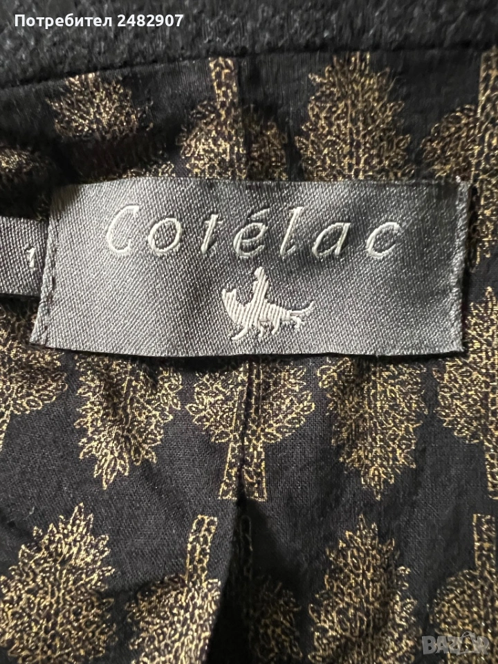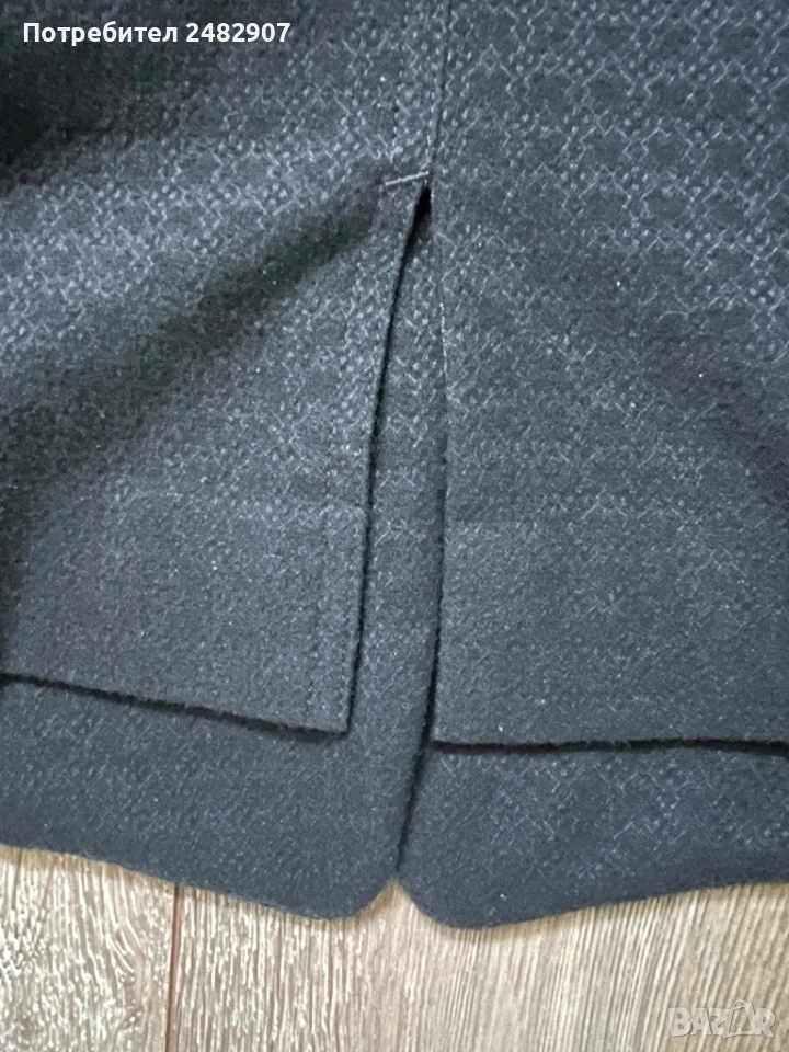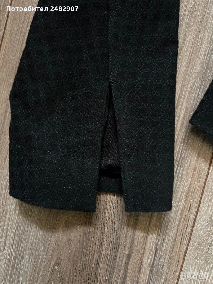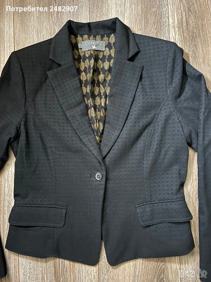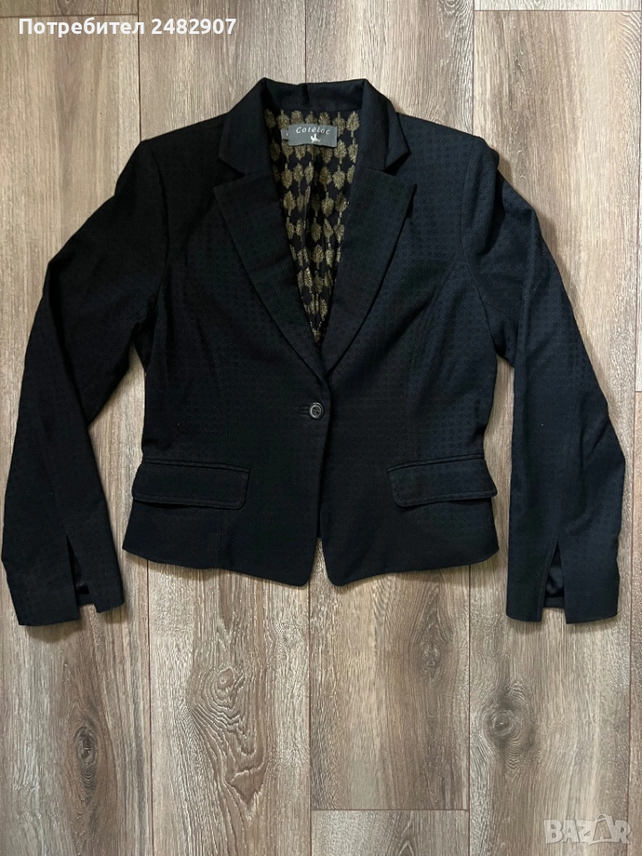 Черно късо дамско сако с подплата и подплънки на раменете, размер S. Ширина в раменете - 38 см, ширина под мишниците - 46 см, ширина в долната част - 45 см, дължина от рамото до долу - 53 см, дължина на ръкава от рамото - 59 см, ширина на ръкава в долната част - 14 см. Много запазено, обличано веднъж за повод, с цепки на ръкавите и на гърба, с два джоба отпред и закопчаване с едно копче. Много стилно и изключително висококачествено изработено.