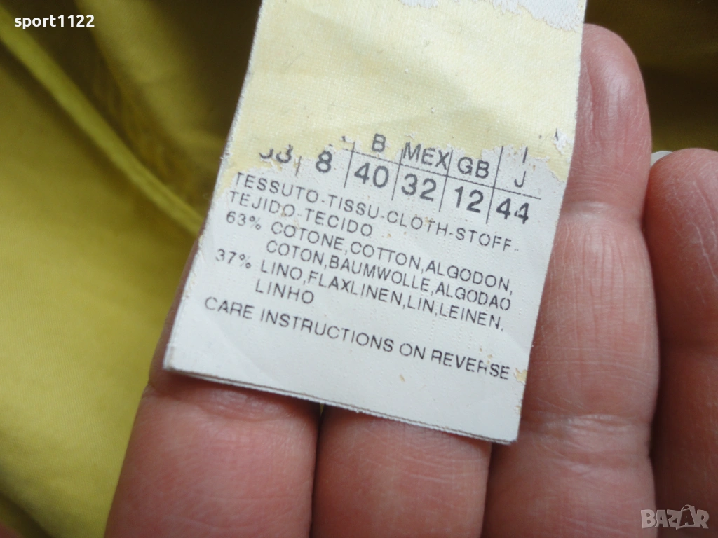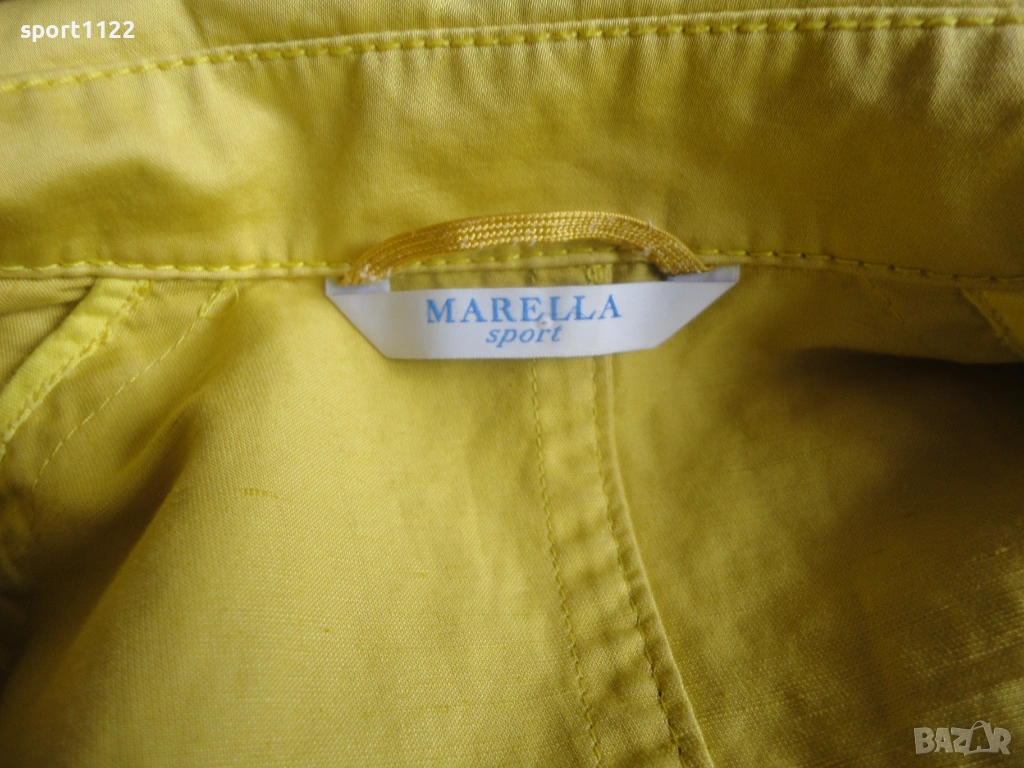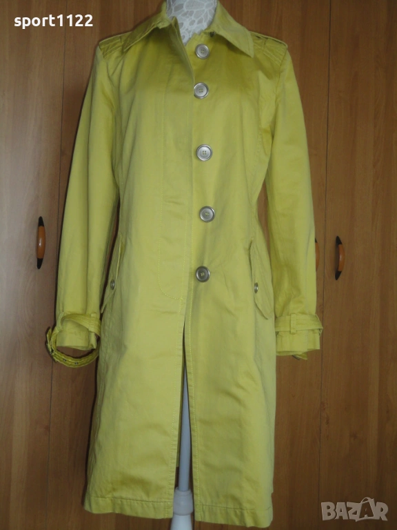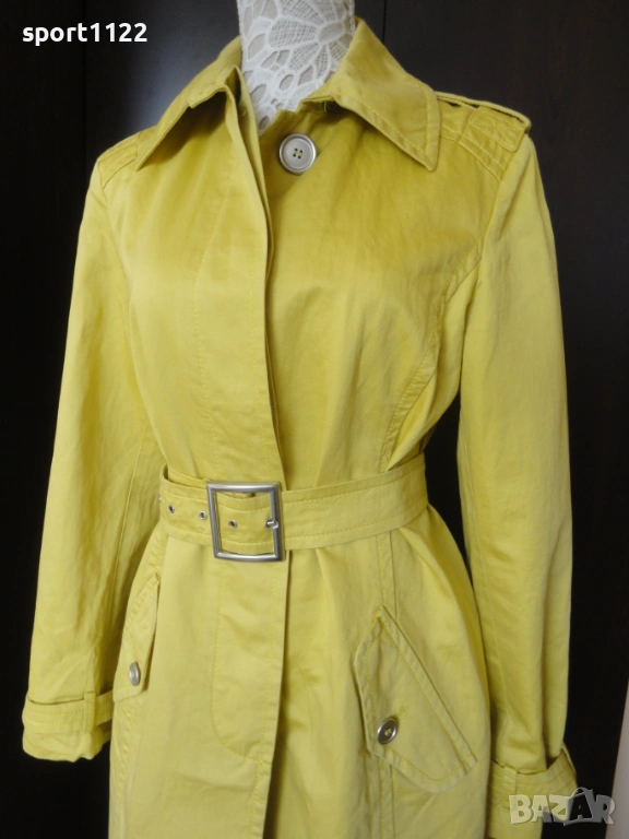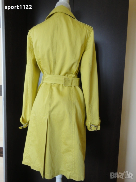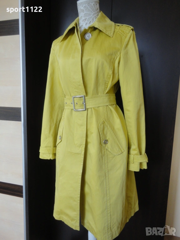 Max Mara Group/, в отлично състояние. Състав 63% памук, 37% лен, лимоново жълт цвят. С големи скрити метални копчета и метална катарама. Отвътре без хастар, много подходящ за пролетта. Ползван е няколко пъти, без забележки. Вътрешният етикет за съжаление го залепих за ютията, но го снимах, за да се види състава на материята.
