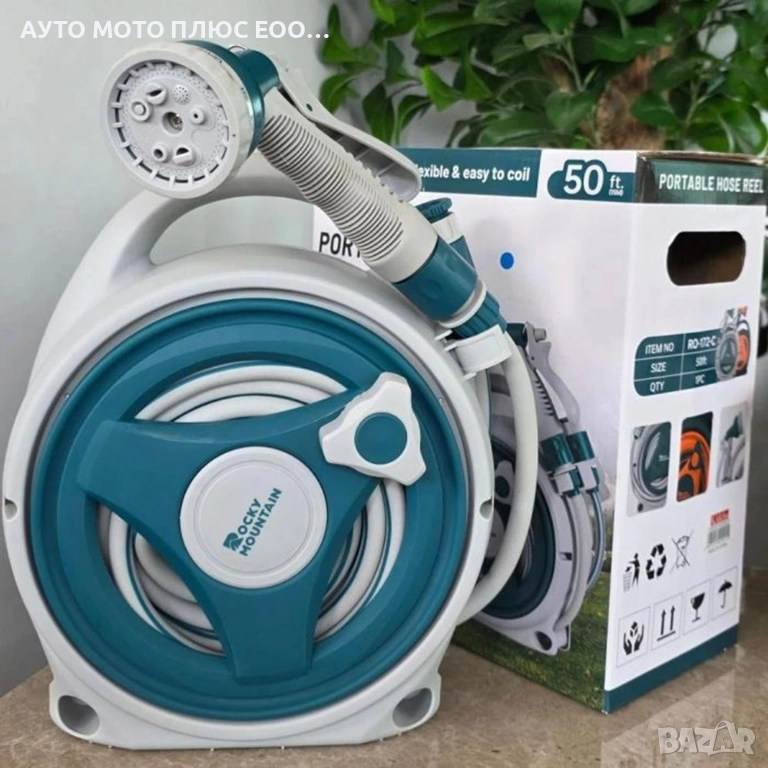 Практичен и удобен комплект градински маркуч с макара, създаден за лесно и ефективно поливане и почистване.