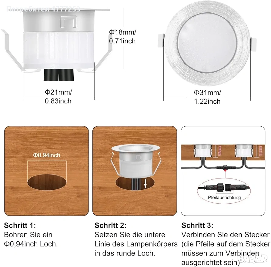 IP67 , 50 000 часа живот. Размерът на всяка LED точка е D31 x 18,5 mm, отворът е 24 mm;