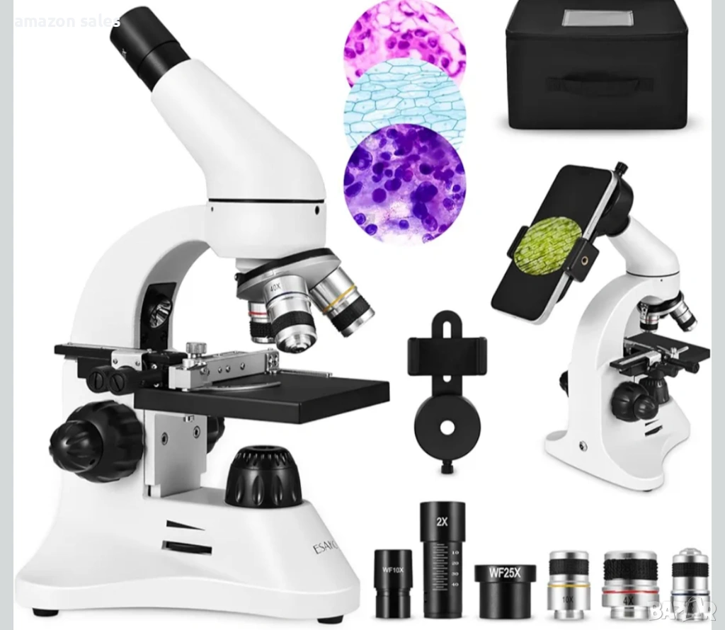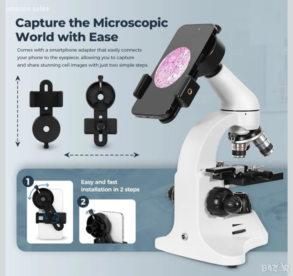 - 【Богати аксесоари】Предлага се с подготвени микроскопски препарати и адаптер за телефон, който ви позволява да свържете телефона си към микроскопа, за да правите видеоклипове или снимки на образеца.