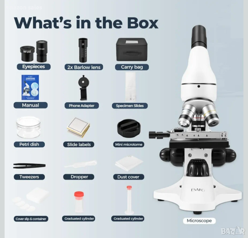 Микроскоп ESAKO 40-2000X, LED светлина,метален корпус,адаптер за телефон и слайдове нов