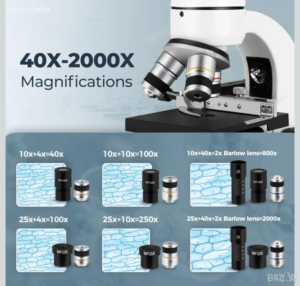 - 【Увеличение от 40X до 2000X】Окуляри с широкоъгълно увеличение 10X, 25X и обективи 4X, 10X, 40X с 2X леща на Барлоу могат да предложат различни увеличения до 2000X. Пълно покритата оптична система осигурява отлично качество на изображението.