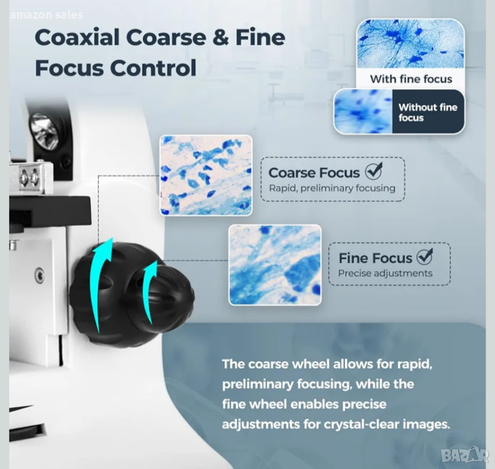 - 【Прецизна система за фокусиране】Здрава метална рамка с коаксиално грубо и фино регулиране за осигуряване на прецизен контрол на фокуса. Петцветен филтър може да променя тона на светлинния източник за по-добър контраст и висококачествени изображения.