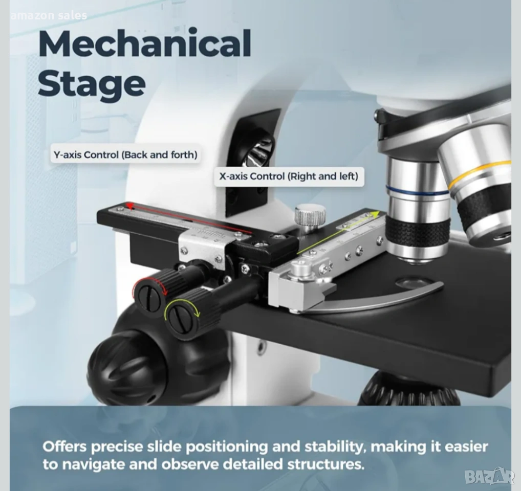 - 【Лесен за употреба】 Вградената голяма механична маса с подвижен държач за предметни стъкла ви позволява да видите цялата площ на образците без повторно подрязване. Наклонена на 45 градуса и въртяща се на 360 градуса глава за по-комфортно и удобно гледане.