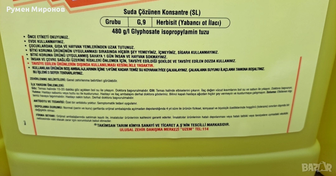 Здравейте, това е професионален хербецид с широк спектър на действие, използван за борба с плевели. До миналата година водех битката със всякаква химия, но не се случваха нещата на 100%. Проблем са ми треви, плевели и бурени на паркинг в София, на вилата тук и в Гърция. Препаратите ставаха все по-скъпи, и изпробвах всякакви варианти. Попаднах на този препарат и останах много доволен, за това започнах и да го продавам. Пропорцията е 200 милилитра от препарата на една пръскачка (моята е 16 литра). Концентрата е 5 литра. Цена 39 евро. Намира се в София, район Божурище. Лично предаване или ЕКОНТ. 0878 266 554