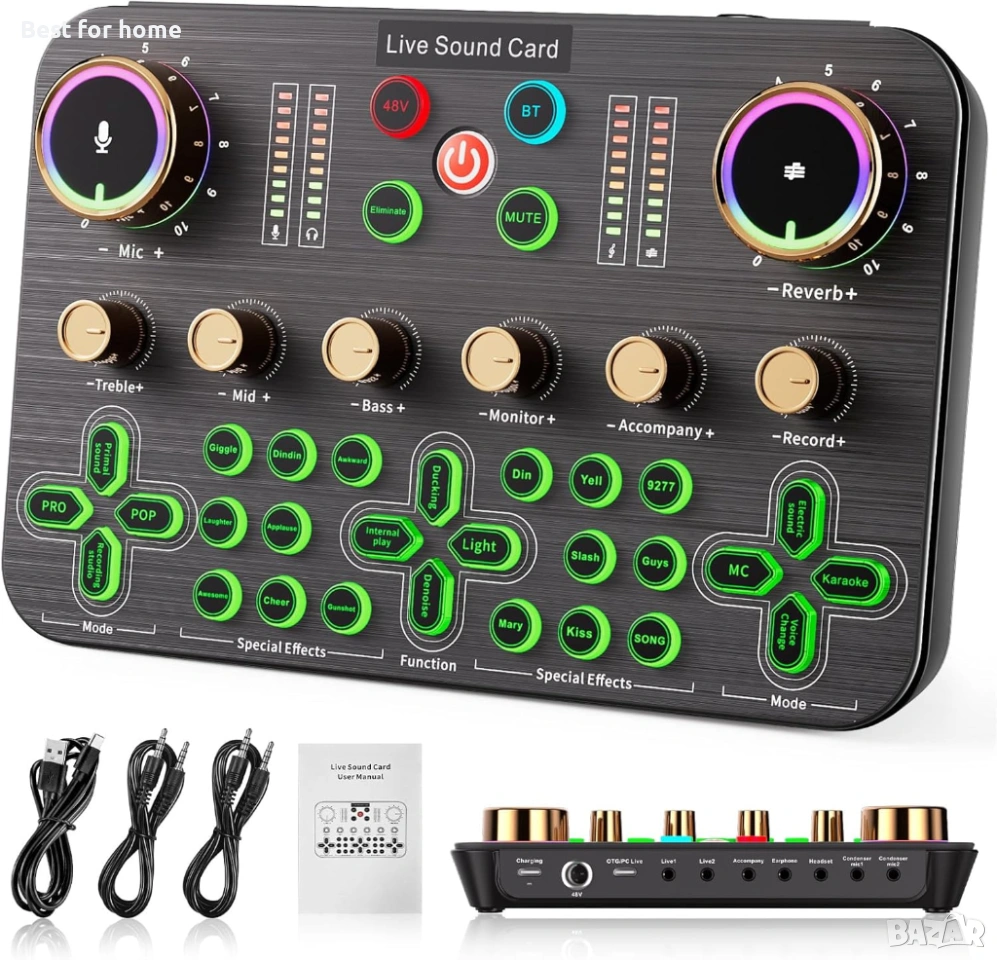 【Включен пакет】-- Комплектът за аудио миксер и подкаст за предаване на живо включва: Платка за звуков миксер x1, 3,5 мм аудио кабел x2, кабел за данни x1, ръководство за употреба x1. Дизайнът на звуковата карта и панела с бутони я прави лесна и лесна за използване, идеална за начинаещи или средно напреднали подкастъри. И предлагаме 1-годишен гаранционен период. Ако имате някакви въпроси или притеснения, моля не се колебайте да се свържете с нас.