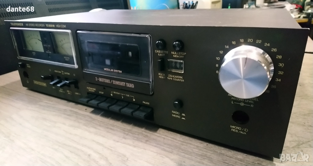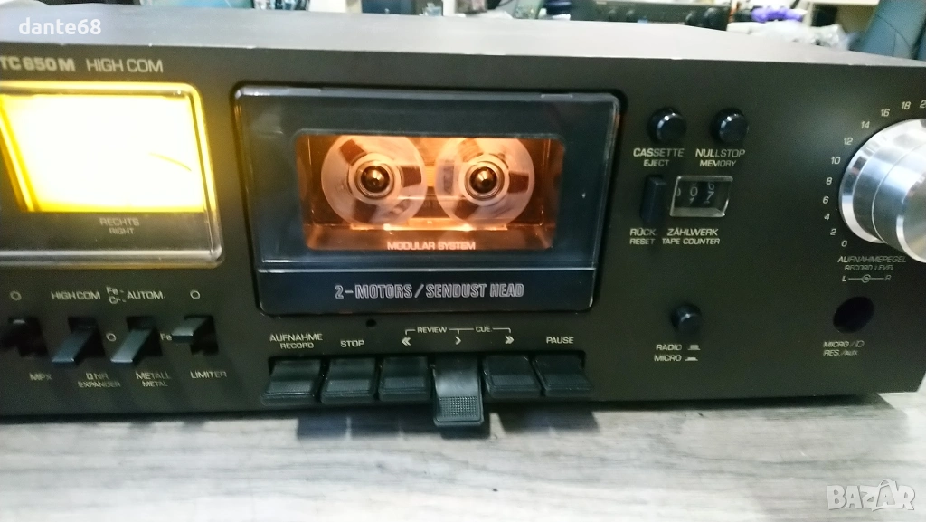 Поредният шедьовър на аналоговата Hi-Fi техника. Тежка и масивна машина, без компромиси в качеството на изработка от 1979 година. Няма да ви засипвам с технически данни, в нета е пълно с тях. Състоянието на дека е абсолютно безупречно. Дойде при мен с изгорял десен стрелкови индикатор, някой в опит да го прави нещо беше накъсал зверски цялата му намотка, затова просто го замених и вече е всичко е наред, това му беше проблема, всичко останало е абсолютно перфектно. Глави, ролки и въобще цялата механика е истински инженерен шедьовър! Двумоторен със сендастови глави в перфектна кондиция. Няма хикави намеси по електрониката, аз поне не видях да има такива, оригинална елементна база. High Com системата работи просто уникално. Който е имал късмета да прави записи с такава, знае на какво е способна, премахва хиса в звука до нива, които на практика не се чуват. Telefunken я слагаха само на топ машините си и независимо, че ТС650М е двуглав е предвиден основно за студийна и професионална работа. Просто е правен да носи на шамари, което личи и от самата конструкция на машината. Бих посъветвал следващият му собственик да го отвори само, за да се наслади на това, което ще види в него! Трябва само да видите как са реализирали плавното отваряне на гнездото - уникално е :) , просто уникално, както междувпрочем и всичко останало! Разбираемо има леки външни следи от близо 50 годишната му вярна служба, която по мое мнение при правилна експлоатация и поддръжка ще откара поне още толкова - така ги правеха тогава.