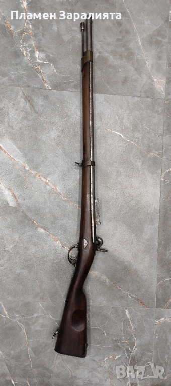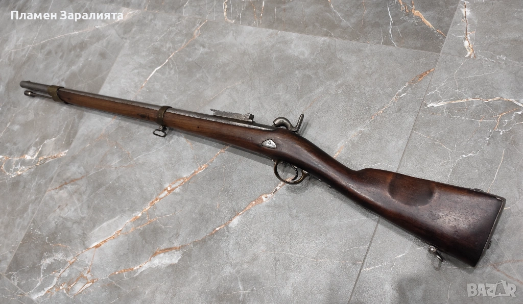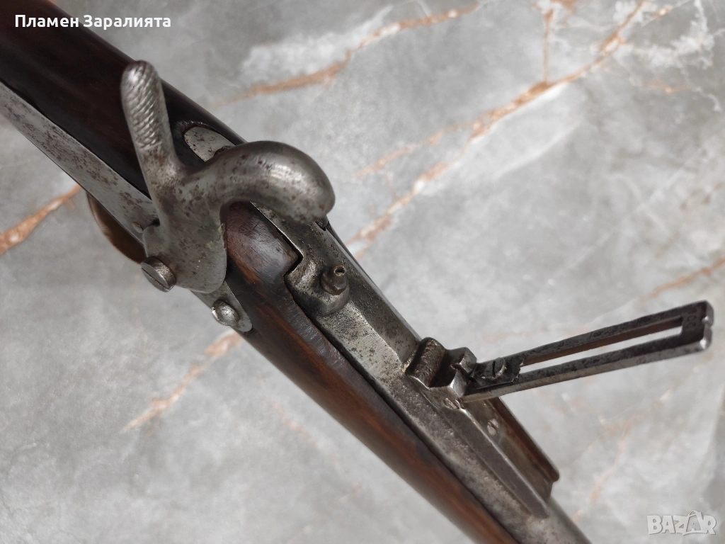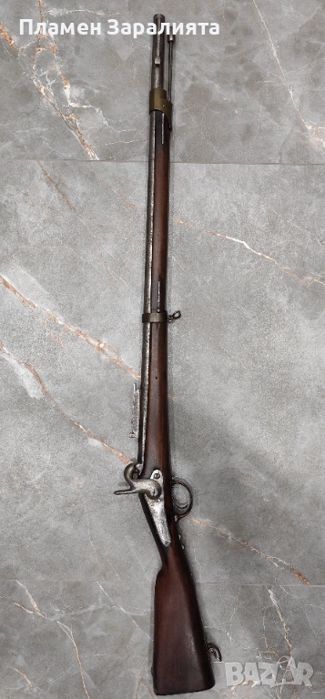 Перфектна капсулна пушка от 19 век. Армейски мускет. Всичко работи и състоянието е много добро. Клейма по механизъм , гривни и приклад. Обща дължина 125.5 см