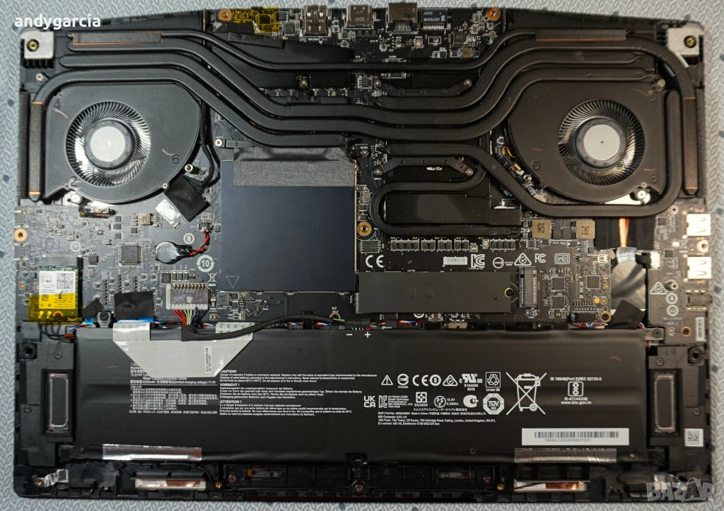 - Освен изборените, лаптопа разполага с много ефективно охлаждане с цели 3 споделени топлинни тръби м/у процесора и видеото, + още 1 за процесора и + още 3 за видеото, всички завършващи в общо 6 радиатора : по 2 в задната част и по 1 отстрани.