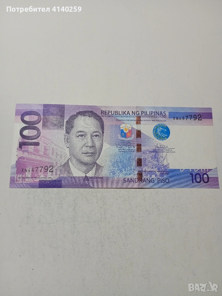 ФИЛИПИНИ БАНКНОТА 100 ПЕСО 2013 Г СЪСТОЯНИЕ НОВО ПОЛУЧАВАТЕ СНИМАНАТА БАНКНОТА РАЗГЛЕДАЙТЕ ДРУГИТЕ МИ ОБЯВИ ДА КОМБИНИРАТЕ ДОСТАВКА ЕКОНТ ЗА ВАРНА ЛИЧНО