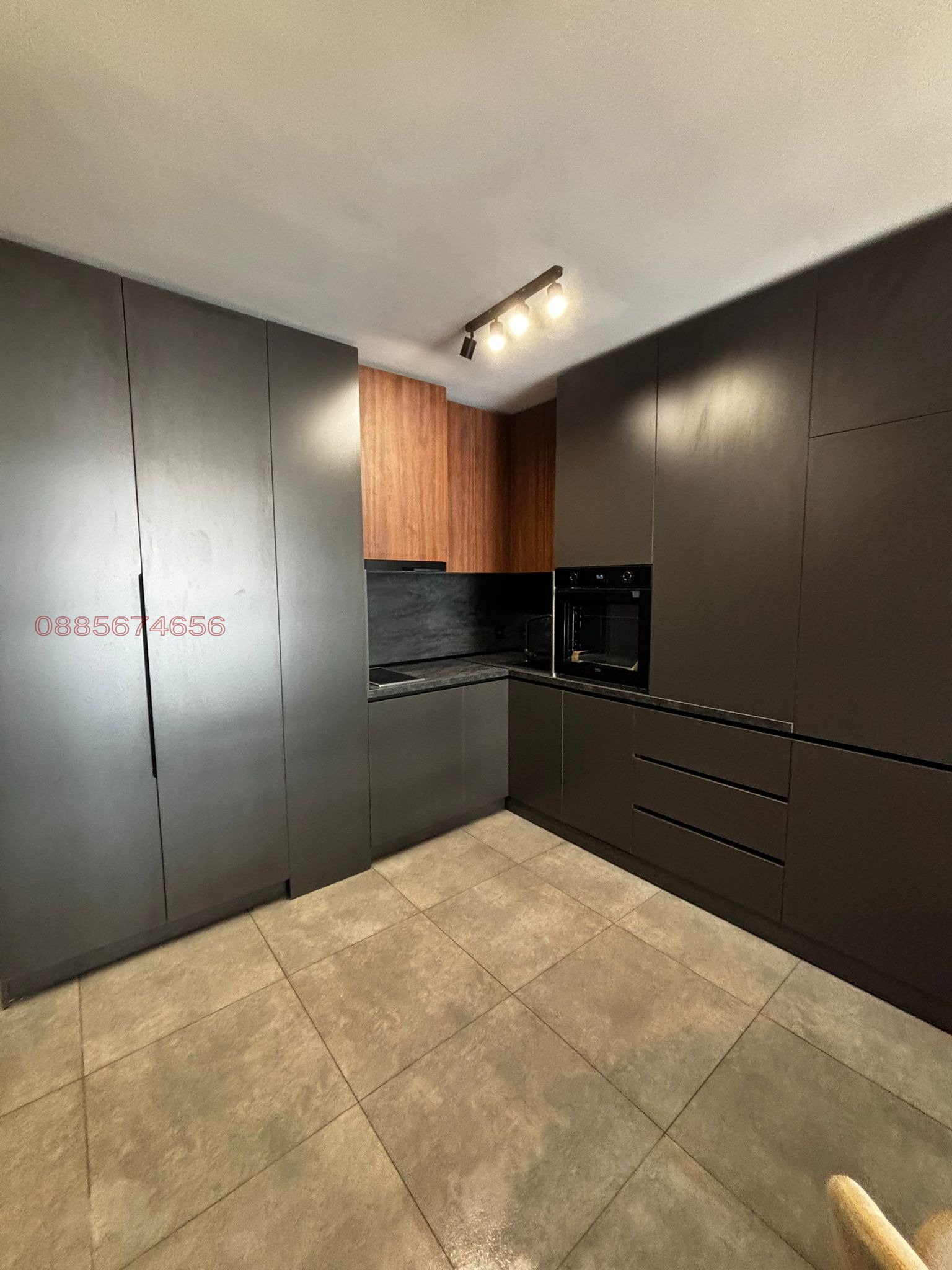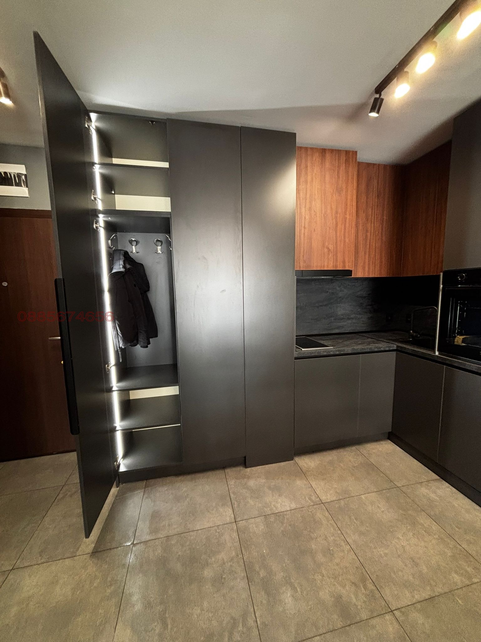 Апартаментът е обзаведен мебели по поръчка и с внимание към всеки детайл и с изцяло изчистена, модерна визия. Всички уреди са вградени, което допринася за максимално стилен и елегантен интериор.