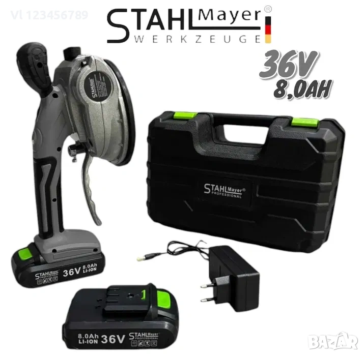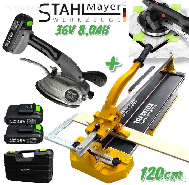 ПРОМО КОМПЛЕКТ Релсова Машина за рязане на плочки с лазер 1200мм + Акумулаторна Вакум Вендуза за Плочки STAHLMAYER 36V 8.0AH 2 броя батерия и куфар.