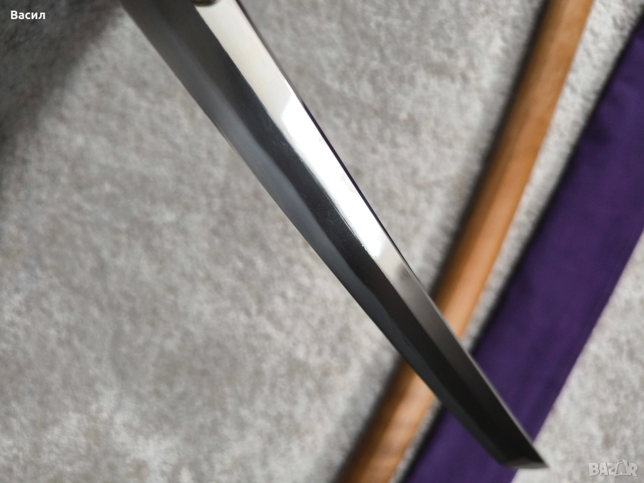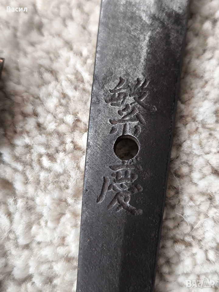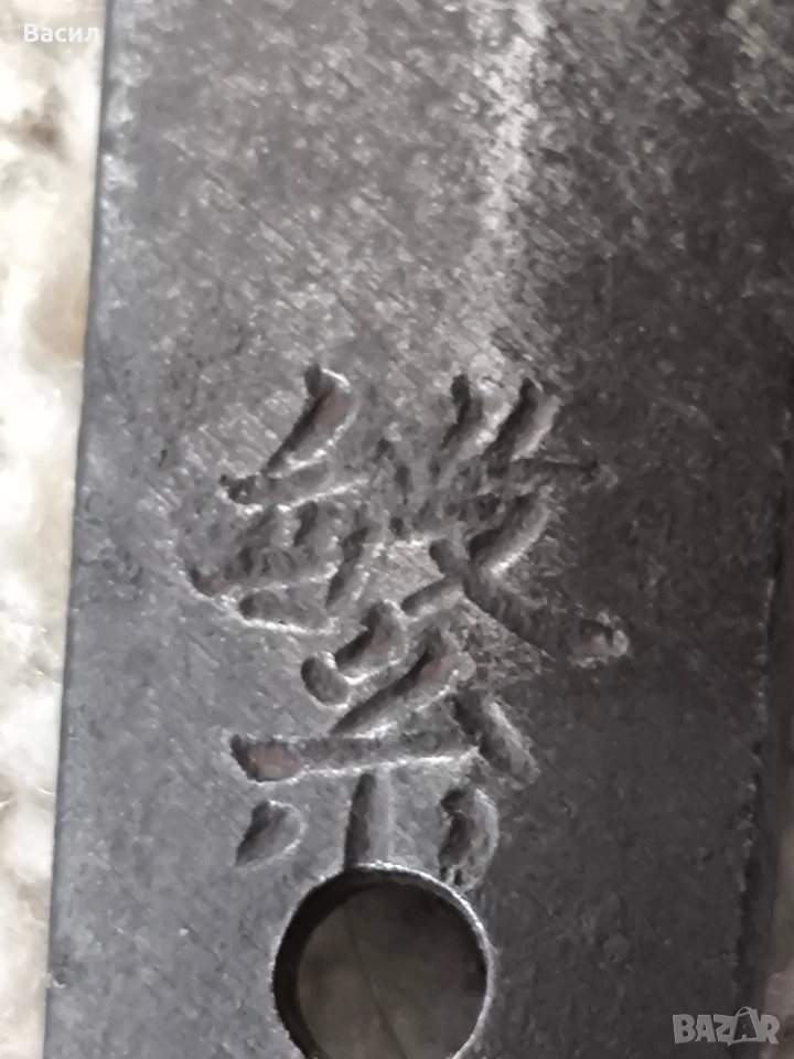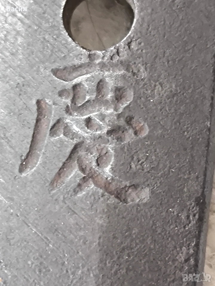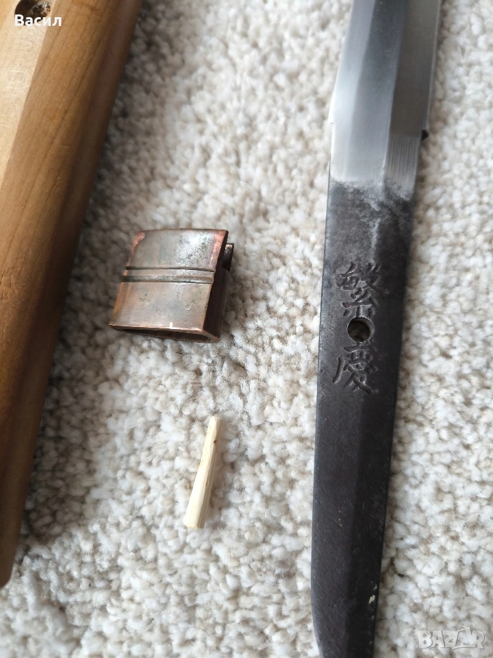 Рядко японско уакизаши от периода Едо-Шинто (началото на XVII в.) Подписано: Ханкей (繁慶 / Hankei) Продавам изключително добре запазено антично японско острие (уакизаши) от ранния период Едо. Острието носи подписа на легендарния майстор Ханкей – бивш ковач на пушки за клана Токугава, известен със своята уникална стомана и мощен стил на подписване. Технически характеристики: Тип: Уакизаши (Wakizashi) Период: Едо-Шинто (началото на XVII век) Подпис (Mei): Ханкей (繁慶) – изпълнен с характерното дебело длето (Futo-tagane) Нагаса (Режещ ръб): 54 см Танг (Опашка): 11 см Обща дължина на острието: 65 см (метална част) / 79 см (с обкова) Дебелина при хабаки (Kasane): 5.8 мм Ширина при хабаки: 2.7 см (1-1/16") Ширина при йокоте: 1.9 см (3/4") Кисаки (Връх): 2.8 см (1-1/8") Сори (Извивка): 1.3 см Детайли на изработката: Хамон (Закалена линия): Майсторски изпълнен широк Sugu/Notare-ba (права към вълнообразна линия) с отчетлив и красив Boshi (завъртане при върха) от двете страни. Хада (Структура на стоманата): Фин и добре кован Itame (зърниста структура) с видима вътрешна активност. Състояние: Острието е в пълна полировка, изключително чисто. Показва естествени за възрастта си микро-дефекти (Kizu) тип Tate-ware (надлъжни нишки в стоманата), които потвърждават традиционния метод на коване. Без критични дефекти като пукнатини (Hagire), огъвания или отчупвания. За колекционери: Острието притежава всички визуални белези на школата на Ханкей – масивна конструкция и мощен, дълбок подпис. Опашката (Nakago) е с оригинална стара патина. Прекрасен екземпляр за сериозна колекция или изучаване на японското ковашко изкуство.