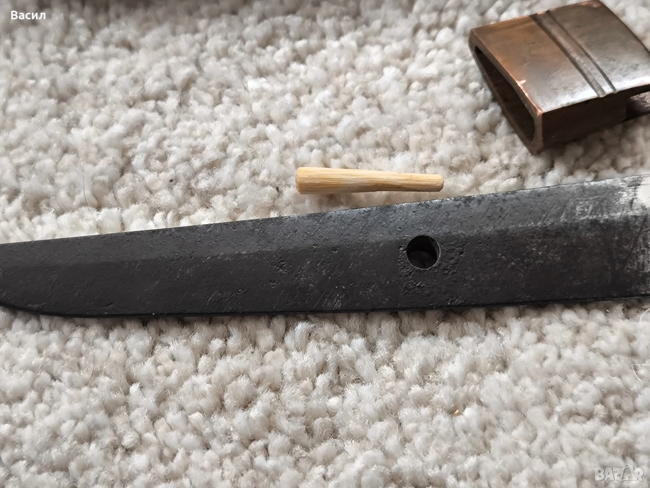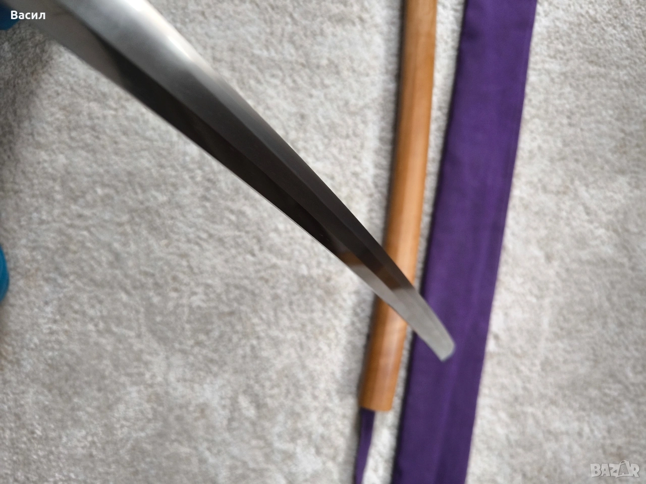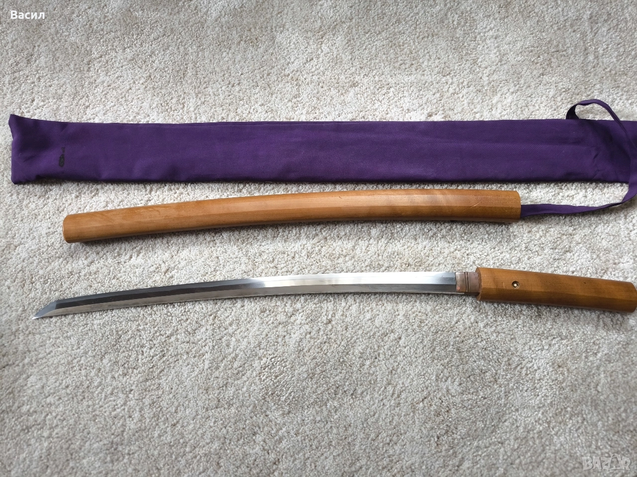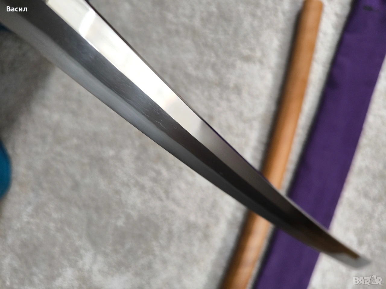 Рядко японско уакизаши от периода Едо-Шинто (началото на XVII в.) Подписано: Ханкей (繁慶 / Hankei) Продавам изключително добре запазено антично японско острие (уакизаши) от ранния период Едо. Острието носи подписа на легендарния майстор Ханкей – бивш ковач на пушки за клана Токугава, известен със своята уникална стомана и мощен стил на подписване. Технически характеристики: Тип: Уакизаши (Wakizashi) Период: Едо-Шинто (началото на XVII век) Подпис (Mei): Ханкей (繁慶) – изпълнен с характерното дебело длето (Futo-tagane) Нагаса (Режещ ръб): 54 см Танг (Опашка): 11 см Обща дължина на острието: 65 см (метална част) / 79 см (с обкова) Дебелина при хабаки (Kasane): 5.8 мм Ширина при хабаки: 2.7 см (1-1/16") Ширина при йокоте: 1.9 см (3/4") Кисаки (Връх): 2.8 см (1-1/8") Сори (Извивка): 1.3 см Детайли на изработката: Хамон (Закалена линия): Майсторски изпълнен широк Sugu/Notare-ba (права към вълнообразна линия) с отчетлив и красив Boshi (завъртане при върха) от двете страни. Хада (Структура на стоманата): Фин и добре кован Itame (зърниста структура) с видима вътрешна активност. Състояние: Острието е в пълна полировка, изключително чисто. Показва естествени за възрастта си микро-дефекти (Kizu) тип Tate-ware (надлъжни нишки в стоманата), които потвърждават традиционния метод на коване. Без критични дефекти като пукнатини (Hagire), огъвания или отчупвания. За колекционери: Острието притежава всички визуални белези на школата на Ханкей – масивна конструкция и мощен, дълбок подпис. Опашката (Nakago) е с оригинална стара патина. Прекрасен екземпляр за сериозна колекция или изучаване на японското ковашко изкуство.