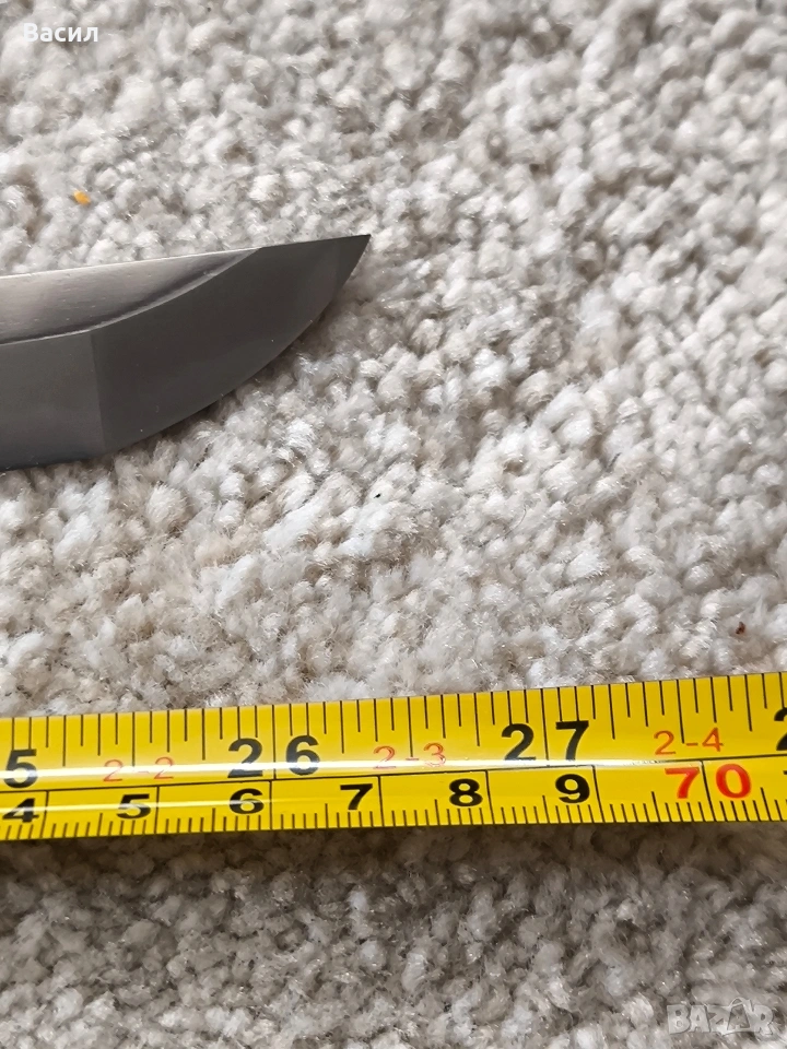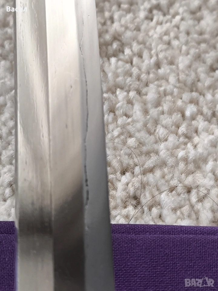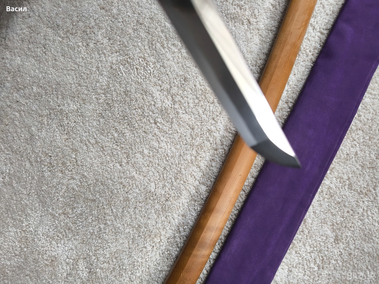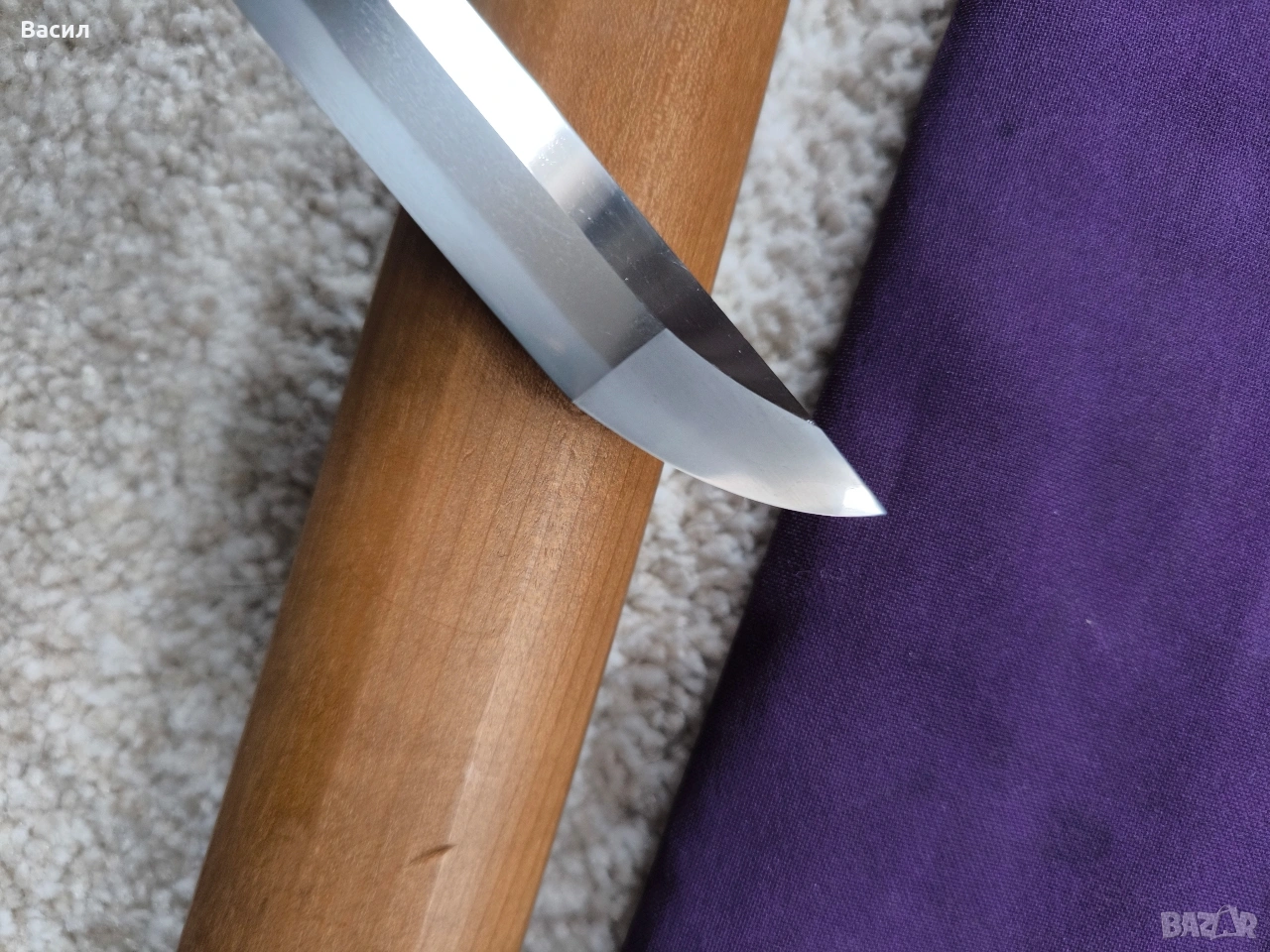 Рядко японско уакизаши от периода Едо-Шинто (началото на XVII в.) Подписано: Ханкей (繁慶 / Hankei) Продавам изключително добре запазено антично японско острие (уакизаши) от ранния период Едо. Острието носи подписа на легендарния майстор Ханкей – бивш ковач на пушки за клана Токугава, известен със своята уникална стомана и мощен стил на подписване. Технически характеристики: Тип: Уакизаши (Wakizashi) Период: Едо-Шинто (началото на XVII век) Подпис (Mei): Ханкей (繁慶) – изпълнен с характерното дебело длето (Futo-tagane) Нагаса (Режещ ръб): 54 см Танг (Опашка): 11 см Обща дължина на острието: 65 см (метална част) / 79 см (с обкова) Дебелина при хабаки (Kasane): 5.8 мм Ширина при хабаки: 2.7 см (1-1/16") Ширина при йокоте: 1.9 см (3/4") Кисаки (Връх): 2.8 см (1-1/8") Сори (Извивка): 1.3 см Детайли на изработката: Хамон (Закалена линия): Майсторски изпълнен широк Sugu/Notare-ba (права към вълнообразна линия) с отчетлив и красив Boshi (завъртане при върха) от двете страни. Хада (Структура на стоманата): Фин и добре кован Itame (зърниста структура) с видима вътрешна активност. Състояние: Острието е в пълна полировка, изключително чисто. Показва естествени за възрастта си микро-дефекти (Kizu) тип Tate-ware (надлъжни нишки в стоманата), които потвърждават традиционния метод на коване. Без критични дефекти като пукнатини (Hagire), огъвания или отчупвания. За колекционери: Острието притежава всички визуални белези на школата на Ханкей – масивна конструкция и мощен, дълбок подпис. Опашката (Nakago) е с оригинална стара патина. Прекрасен екземпляр за сериозна колекция или изучаване на японското ковашко изкуство.