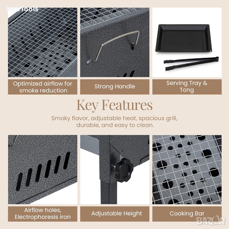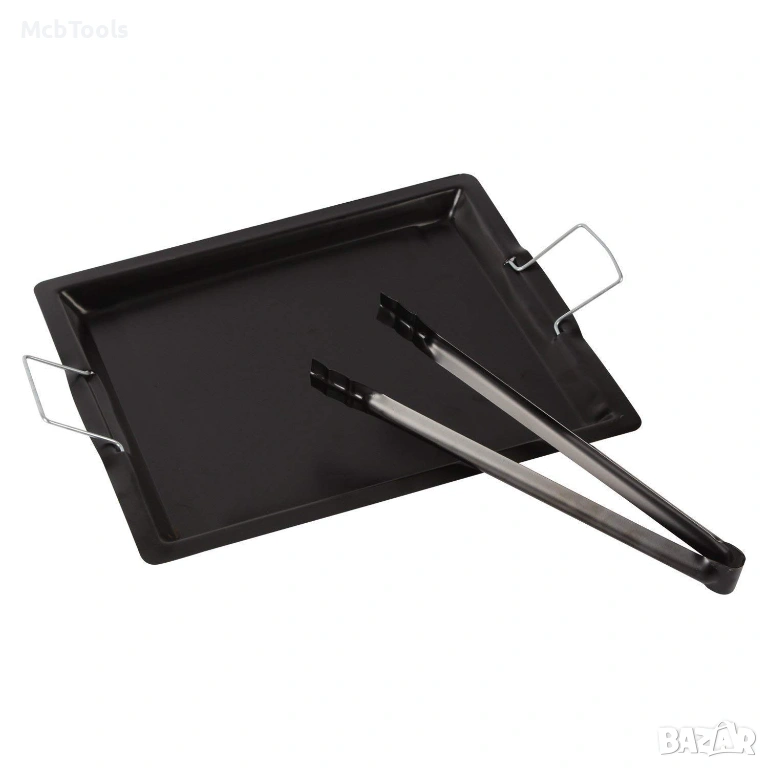 - Комплект всичко в едно: Включва основна скара, допълнителна тава (за готвене или поддържане на храната топла) и щипки.