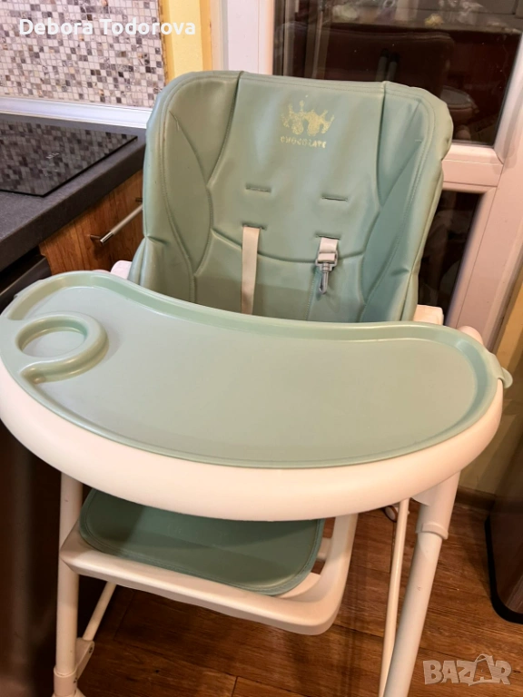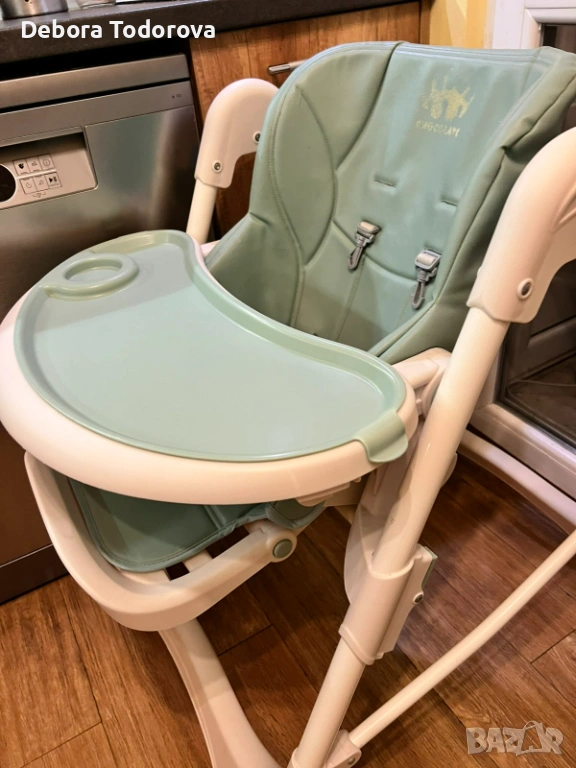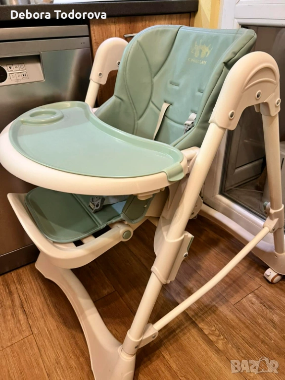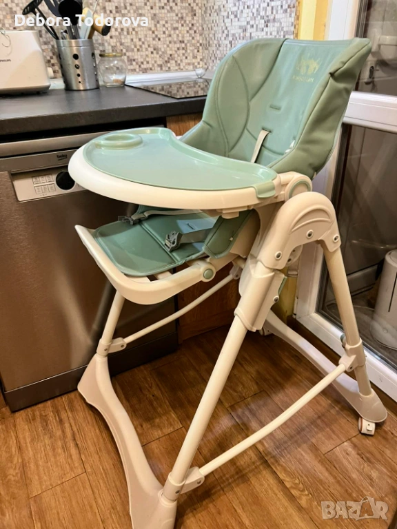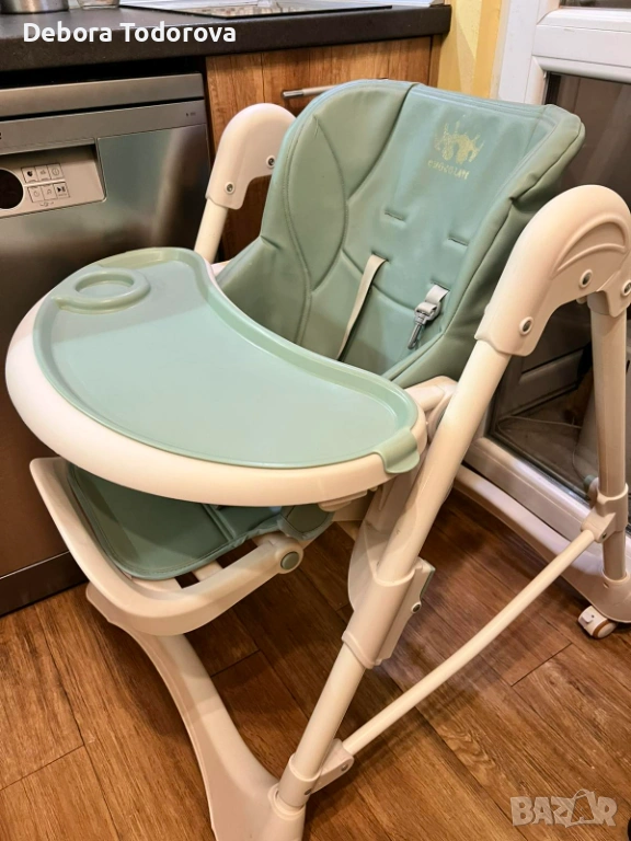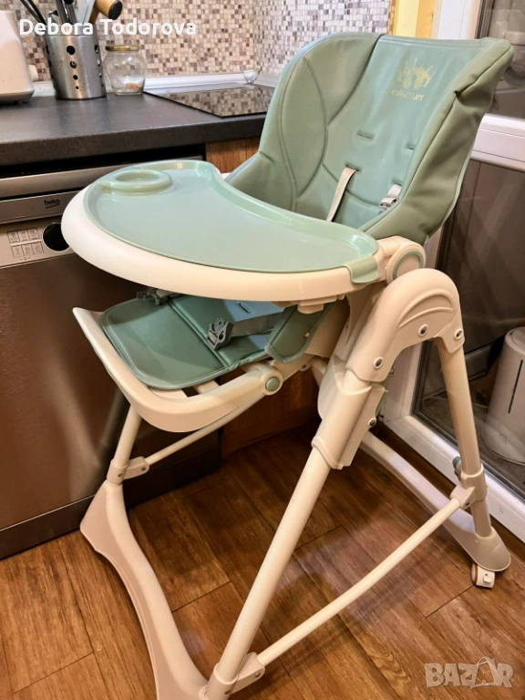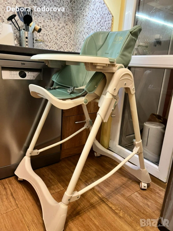 Столче за хранене с регулируема височина, наклон и колани. Има възможност да се сгъва. Таблата се сваля и мие лесно. Тапицерията е от еко кожа и се почиства лесно дори и с мокри кърпички. Няма скъсано, само там където е била щампата на марката е леко изтъркано и под зелената табла има леко петно, но то не се вижда. Мисля, че имам и кошче за съхранение.