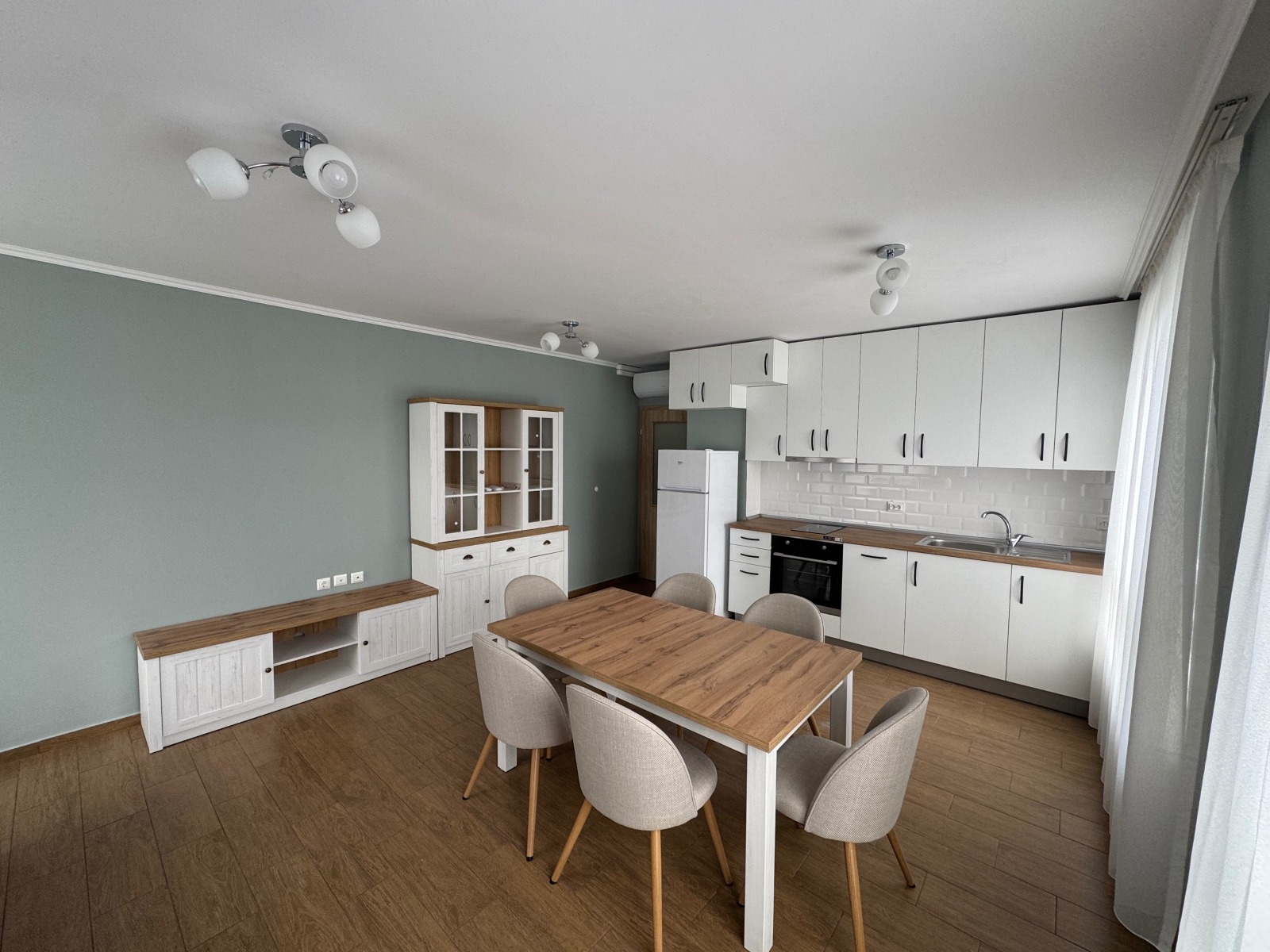 Апартамента се състои се от тоалетна, баня, дневна с трапезария и кухненски бокс, коридор, склад, спалня, втора спалня необзаведена (по желание на наемателя), тераса.