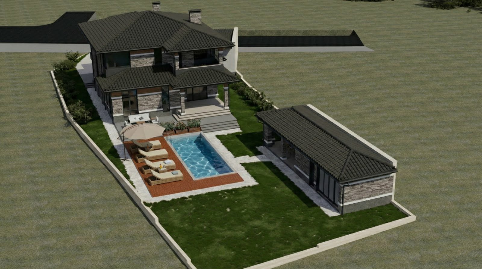 Проектът предвижда двуетажна къща с модерна архитектура, големи прозорци и директен излаз към красиво оформено дворно пространство с басейн и зона за отдих.