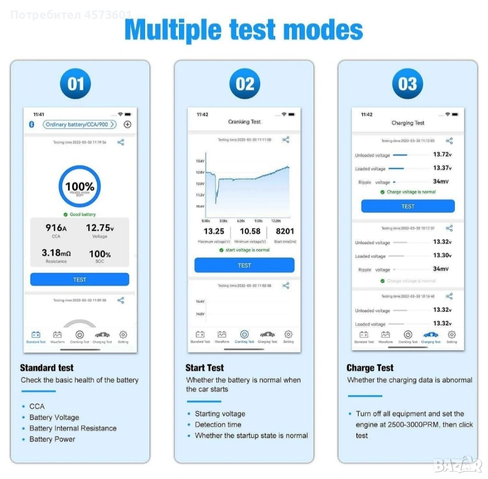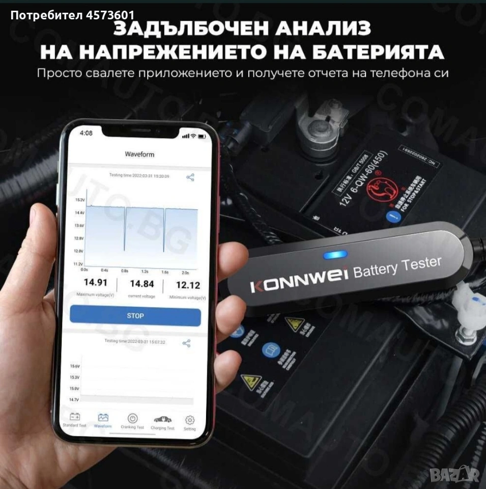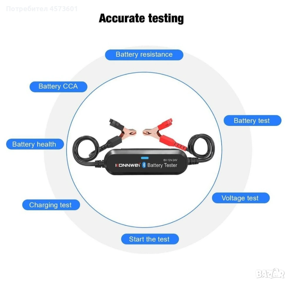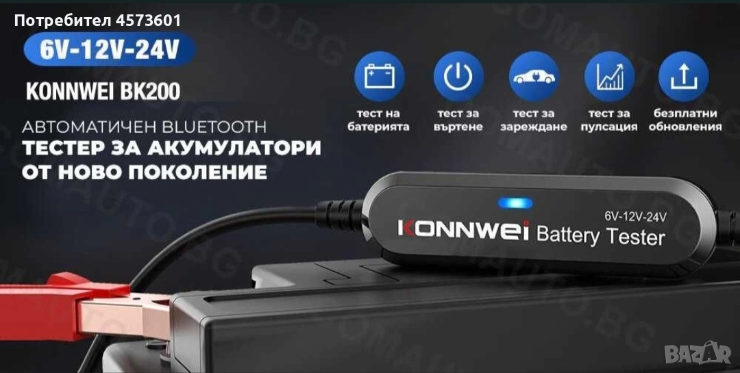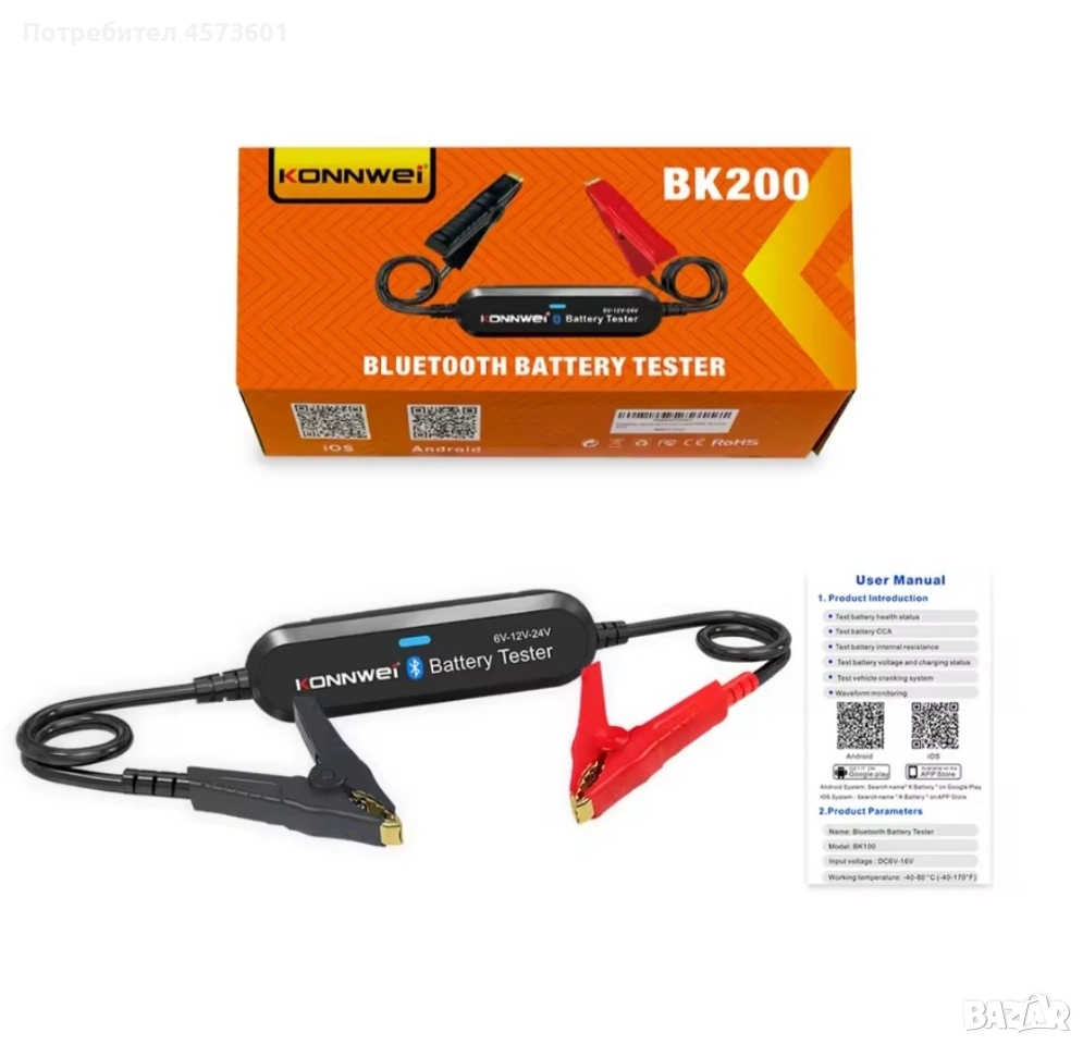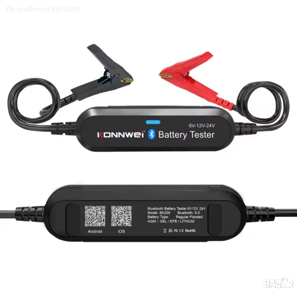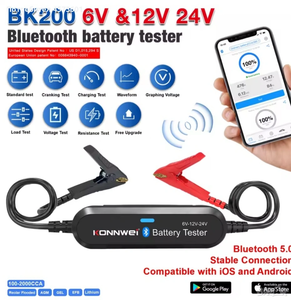 ONNWEI BK200 е отличен безжичен Bluetooth 5.0 тестер за акумулатори за автомобили, мотоциклети и камиони, който работи отлично с батерии от 6V, 12V и 24V. Служи и като анализатор на батерии 100 до 2000 CCA, както и като инструмент за тестване на зареждането. Съвместим е с всички акумулатори: оловно-киселинни батерии, обикновени наводнени, AGM плоска пластина, AGM спирала, GEL и EFB литиеви батерии с тестов диапазон (100-2000 CCA). Може да работи с повечето видове превозни средства: автомобили, мотоциклети, камиони, RV, ATV, SUV, лодки, яхти, косачки и дори колички за голф. Съвместим е с Android и IOS чрез Bluetooth 5.0 връзка.