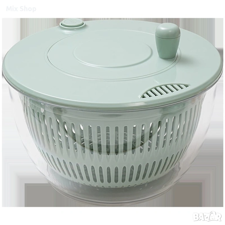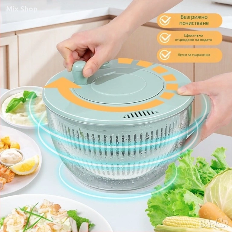 Позволява ефективно измиване и сушене на големи количества маруля и различни видове плодове и зеленчуци.