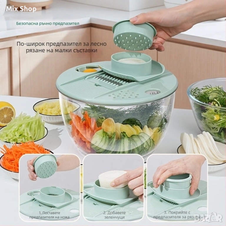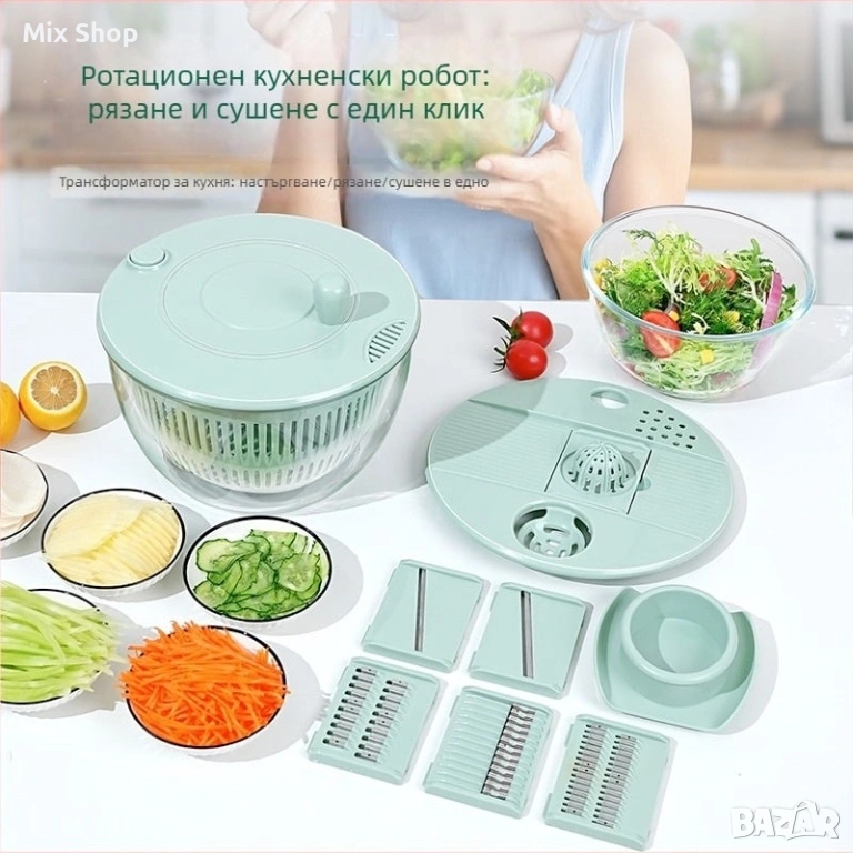 Универсален кухненски уред: Тази 3-в-1 центрофуга за почистване на салата и зеленчуци е тройна задача – измиване, сушене и нарязване, всичко в едно устройство. Оборудвана с 5 различни остриета, тя без усилие реже, нарязва и нарязва на кубчета, отговаряйки на нуждите за приготвяне на разнообразни ястия във вашата кухня.