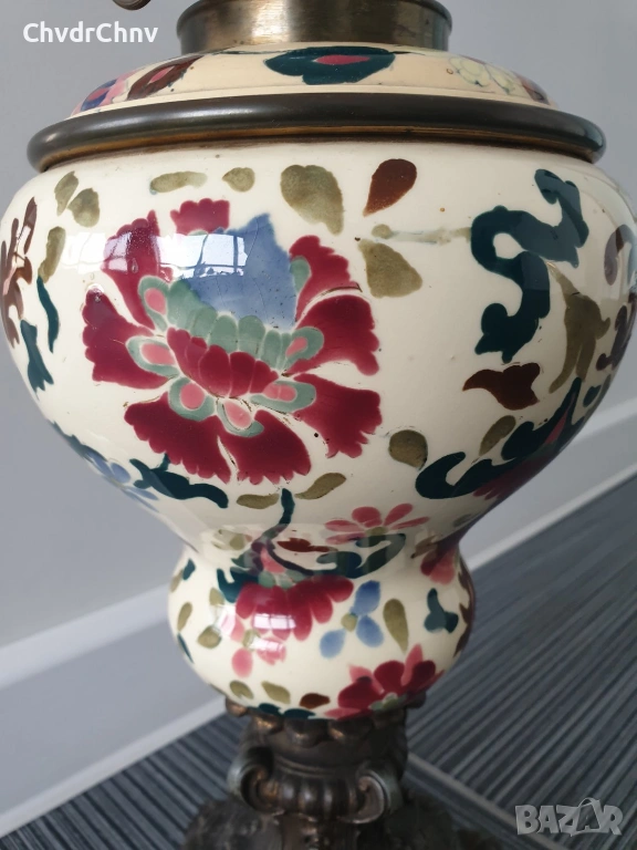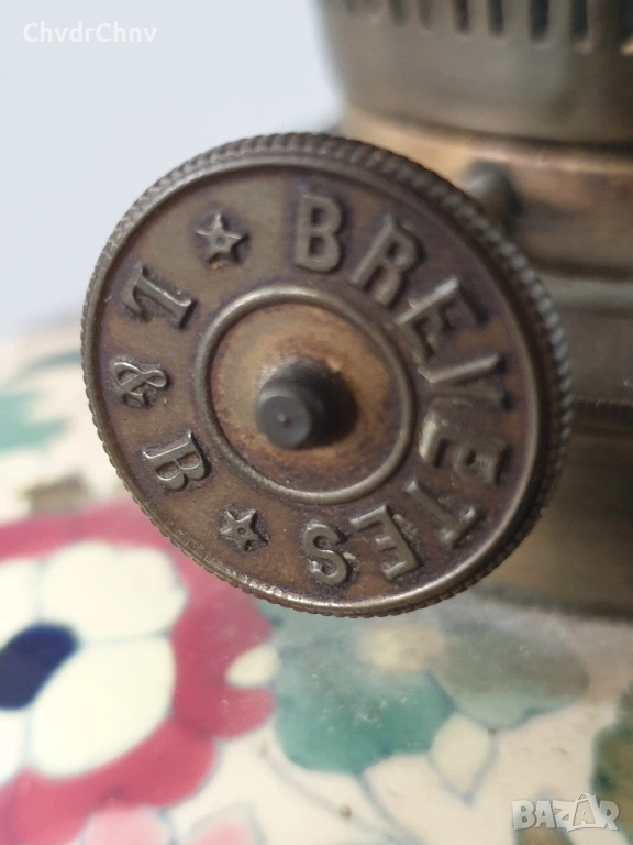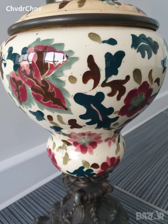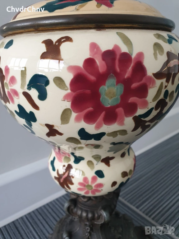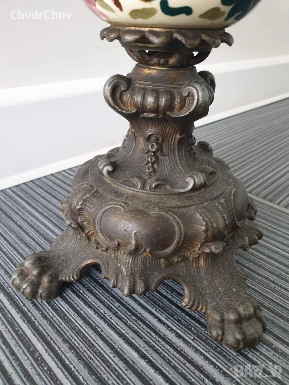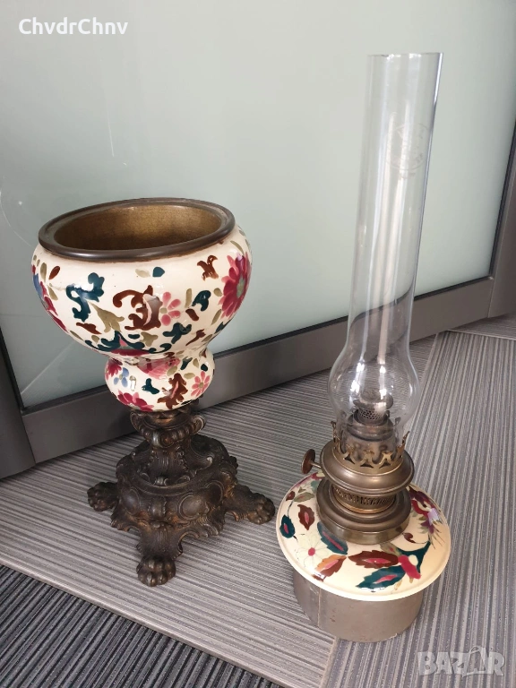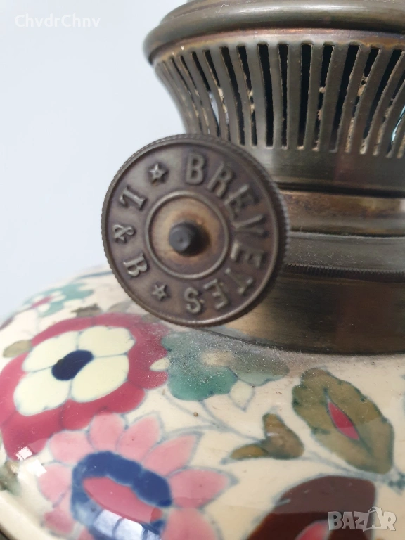Производство Франция 1920-те (компания L&B Brevetes), изработена е от бронз (основа), месинг (контейнер), керамика (ръчно рисувана, флорални мотиви) и стъкло (с маркировка D.S.L. Depose).