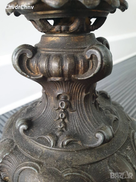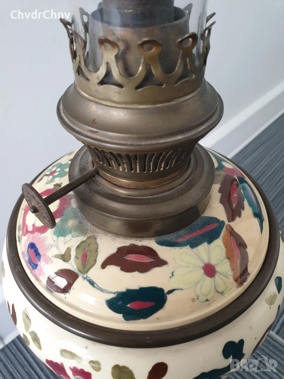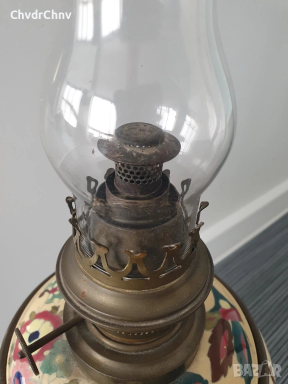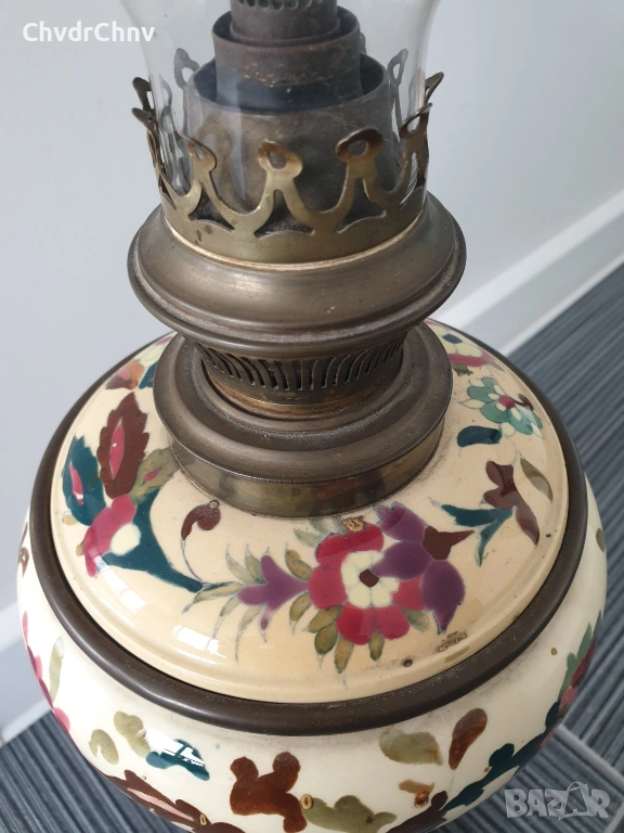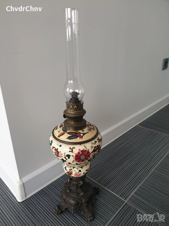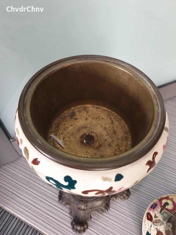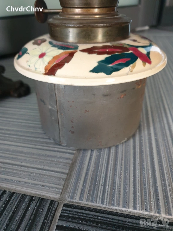 Производство Франция 1920-те (компания L&B Brevetes), изработена е от бронз (основа), месинг (контейнер), керамика (ръчно рисувана, флорални мотиви) и стъкло (с маркировка D.S.L. Depose).