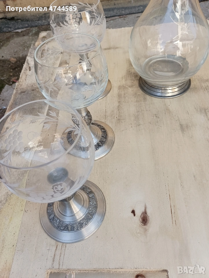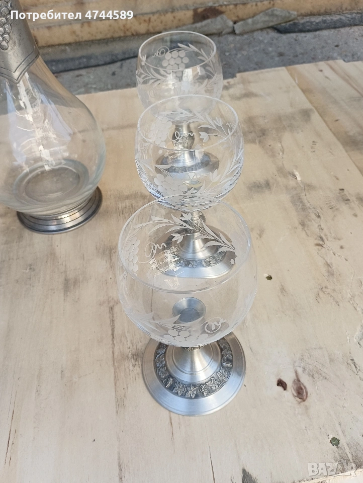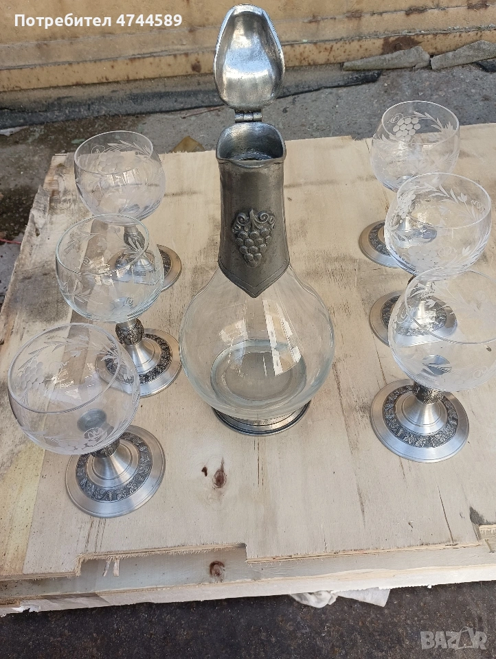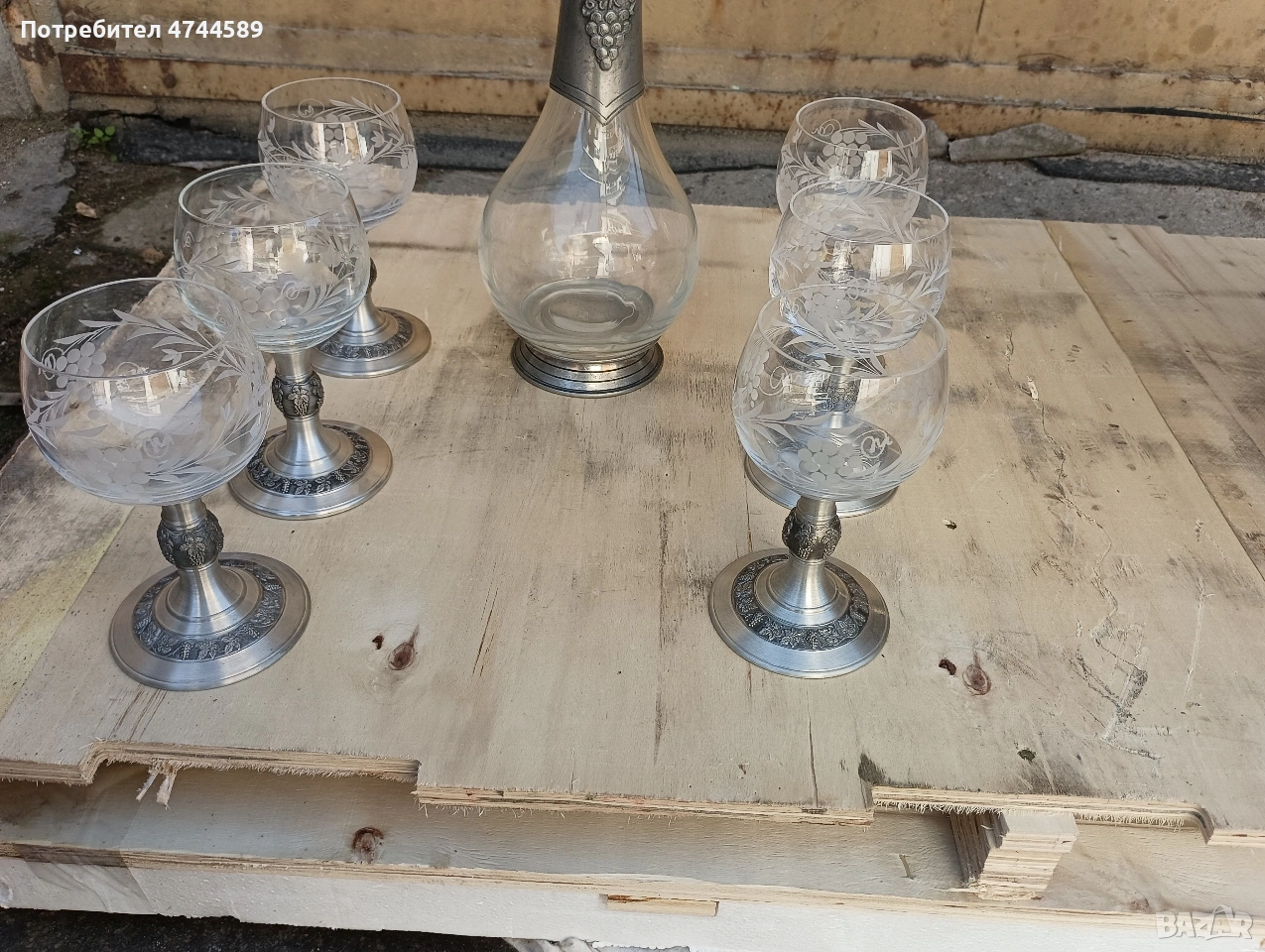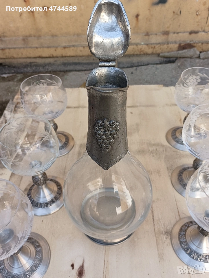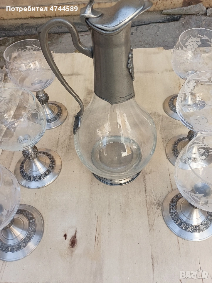 Комплект 6 броя чаши. и графа с орнаменти ръчно правени. в комплек с калаени столчета с 95 процента проба.