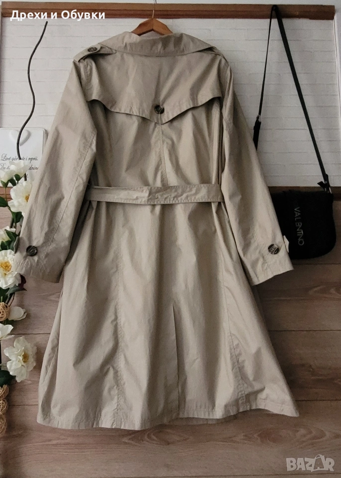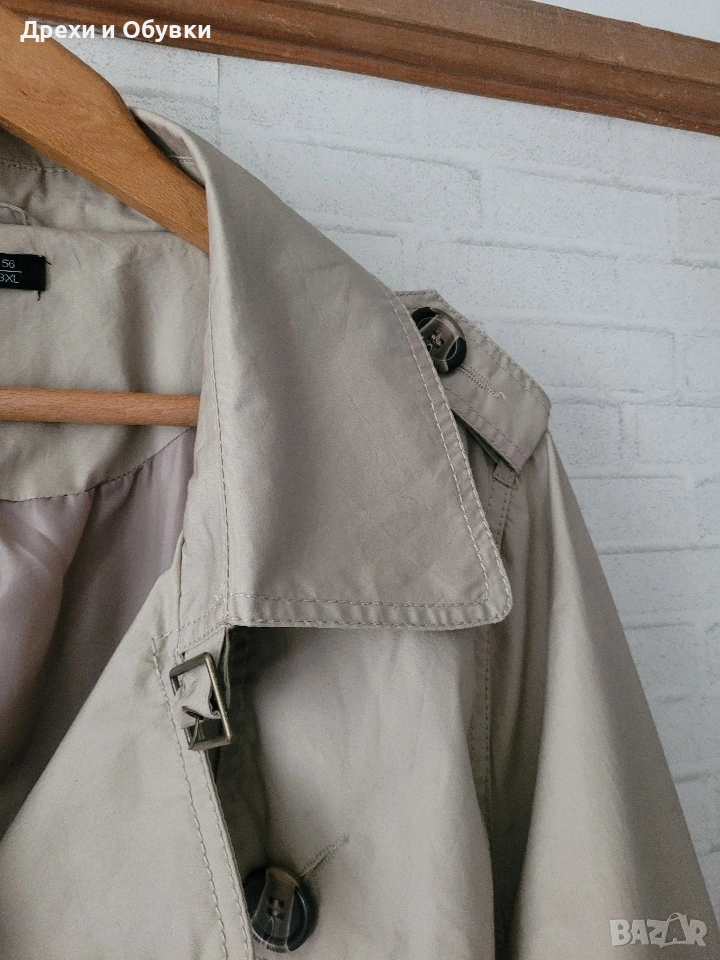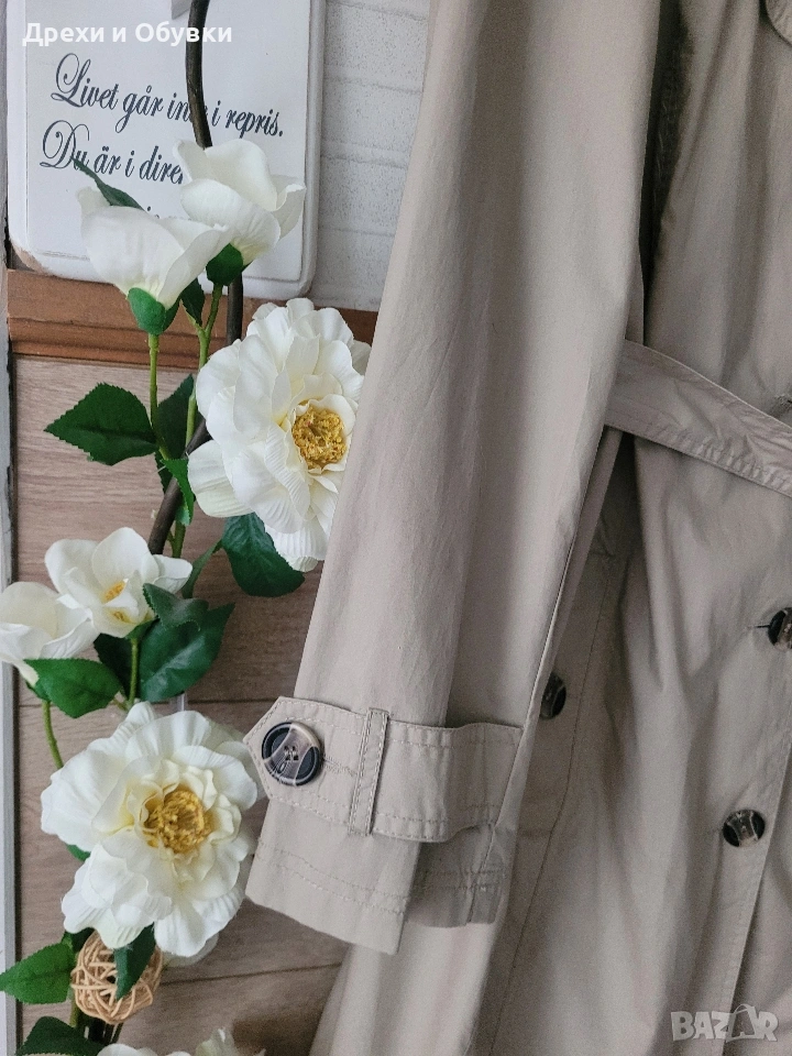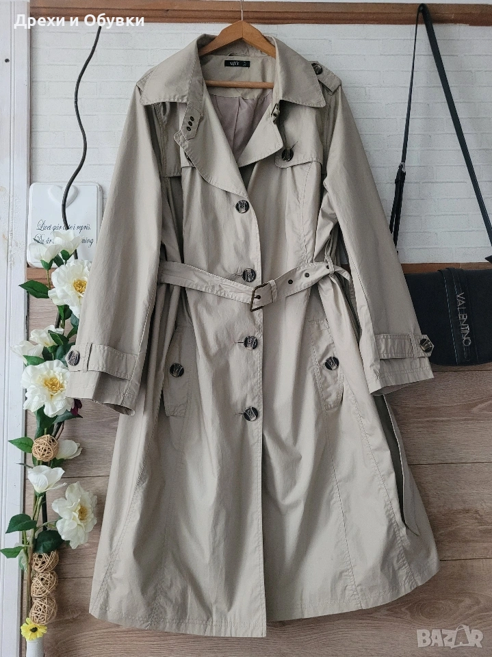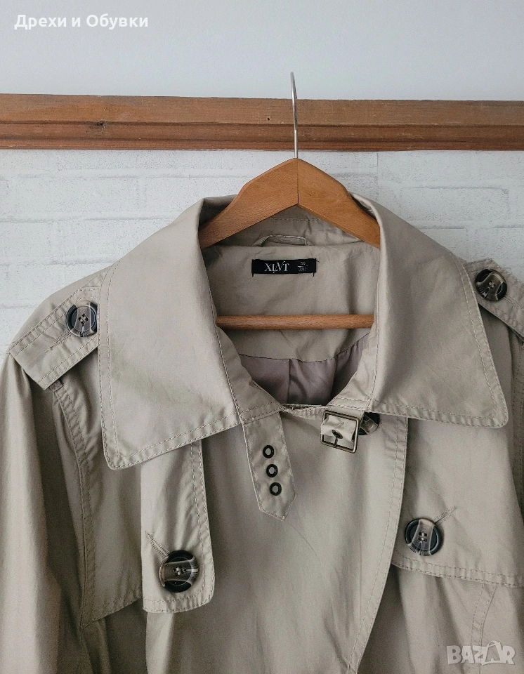 Нов пролетен тренчкот в изключително стилен светло бежов цвят XLNT. Моделът е създаден с внимание към детайла и удобството, като разполага с коланче в талията, което красиво подчертава силуета и позволява регулиране според предпочитанията. Тряенчкотът е снабден с практични джобове с копчета, които придават завършен и елегантен вид. Изработен е от висококачествена външна материя – 100% памук, осигуряваща комфорт, лекота и дишаемост през пролетния сезон. Вътрешната подплата допринася за допълнително удобство и приятно усещане при носене. Размер 3ХЛ Мерки: Гръдна 140см, дължина 107см Перфектен избор за ежедневието или по-елегантни визии – класическа дреха, която лесно се комбинира с рокли, панталони, дънки или пола. Цена 35€