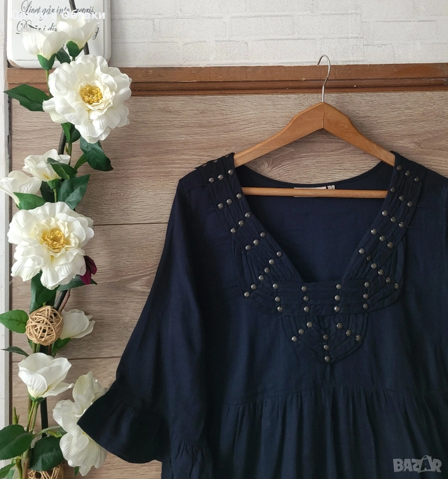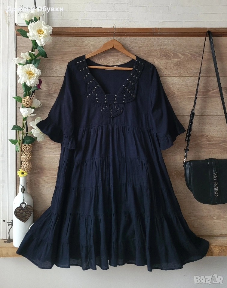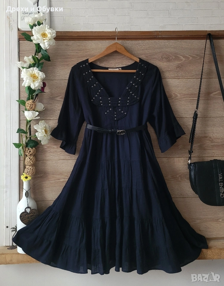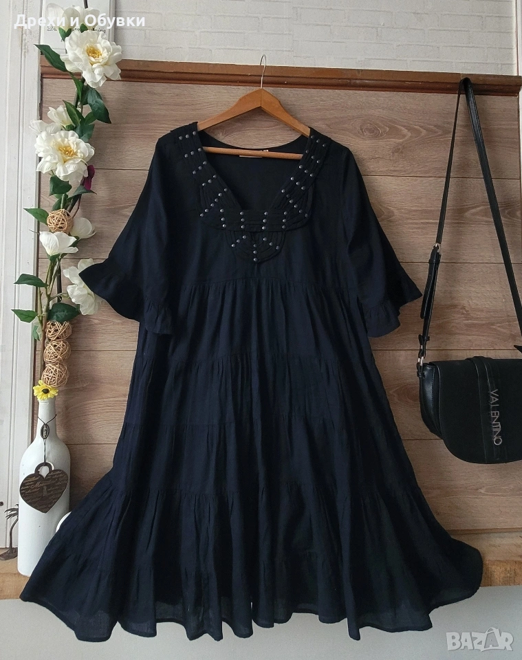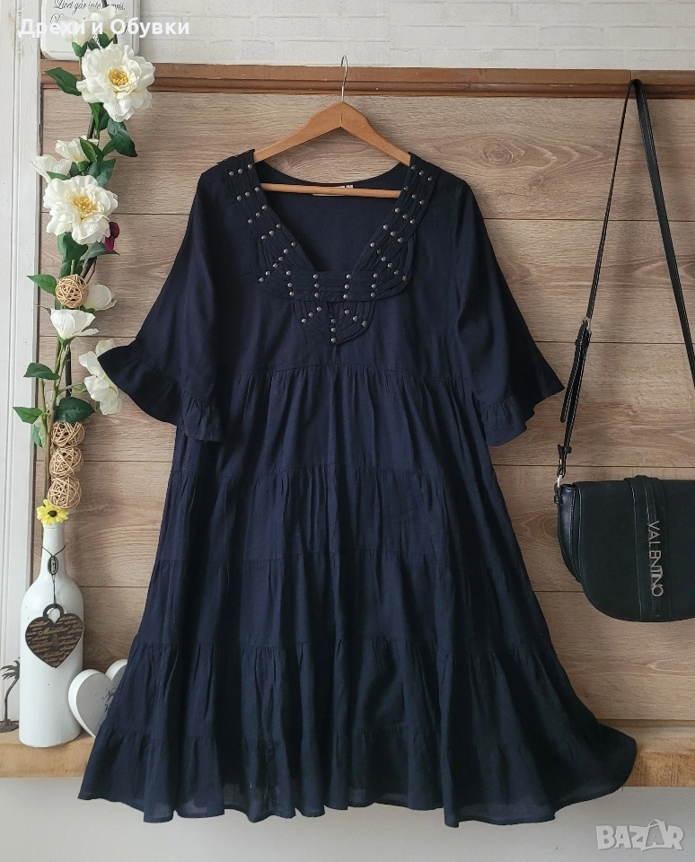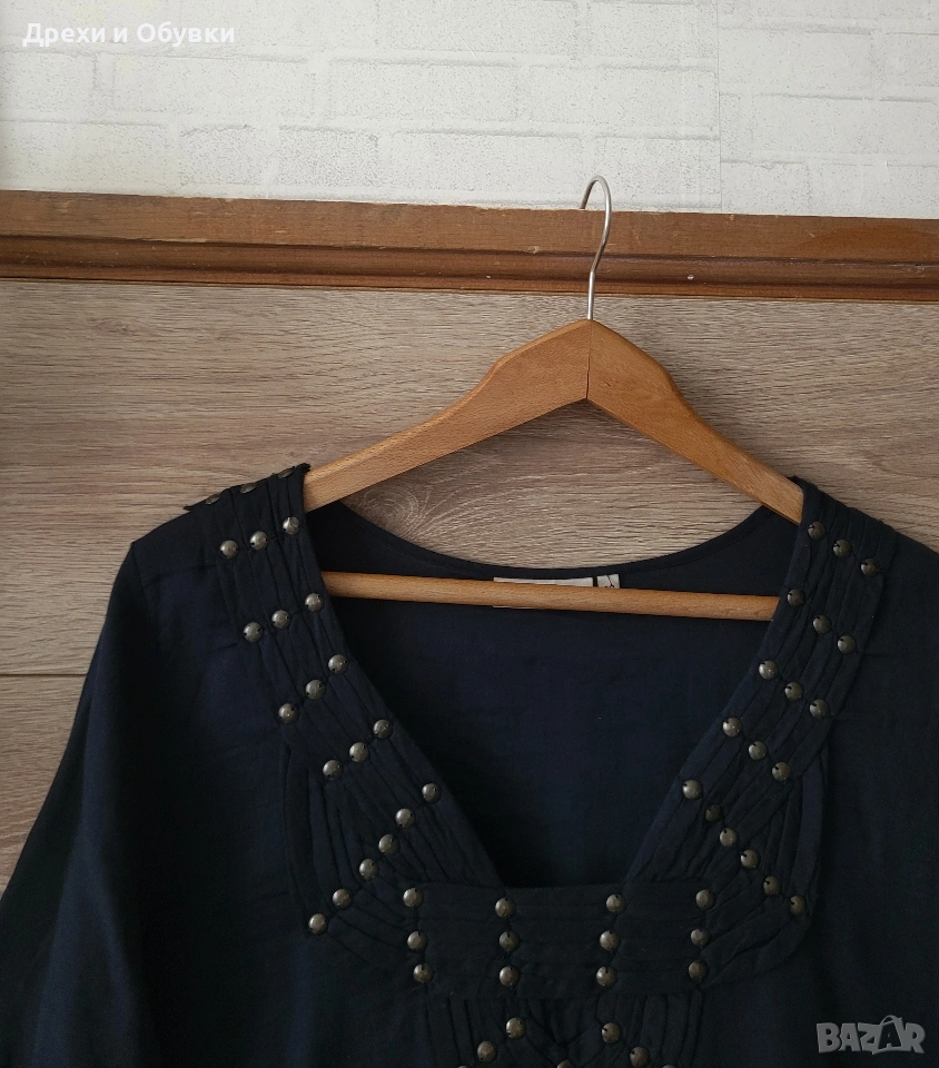 Акцентът е ефектното деколте с пришити метални елементи, които придават модерно излъчване.