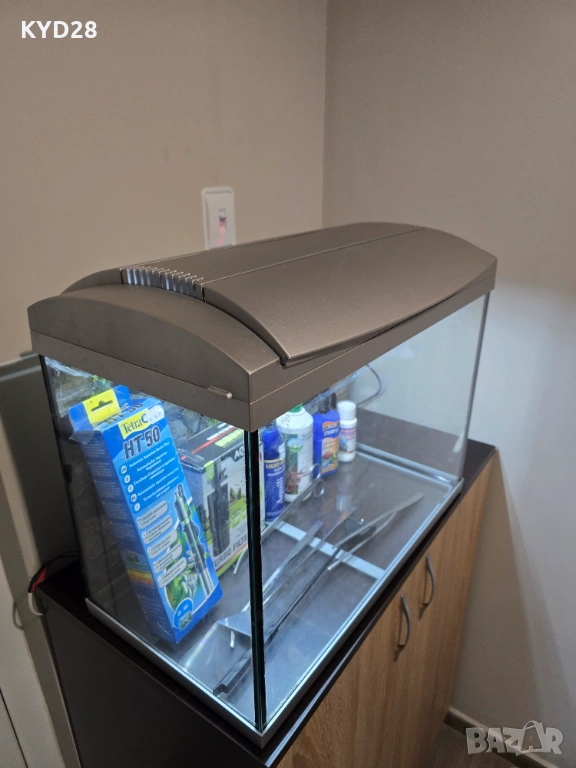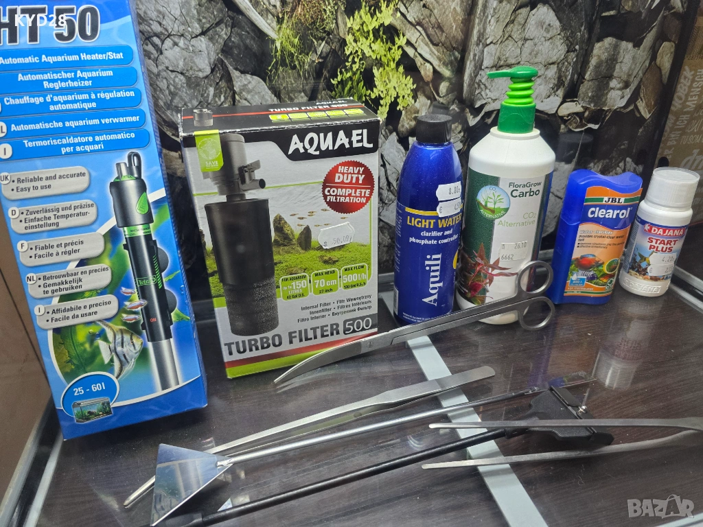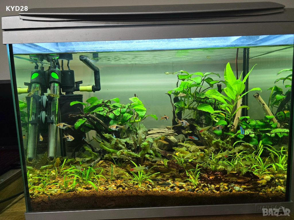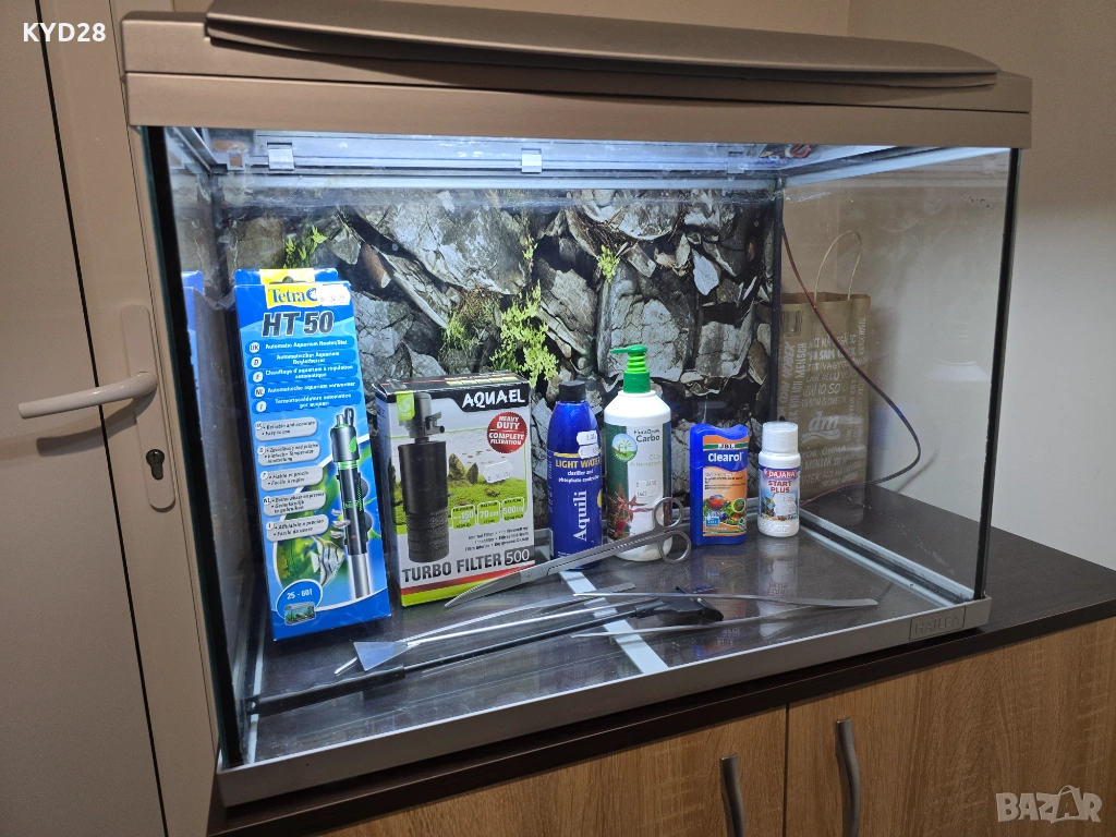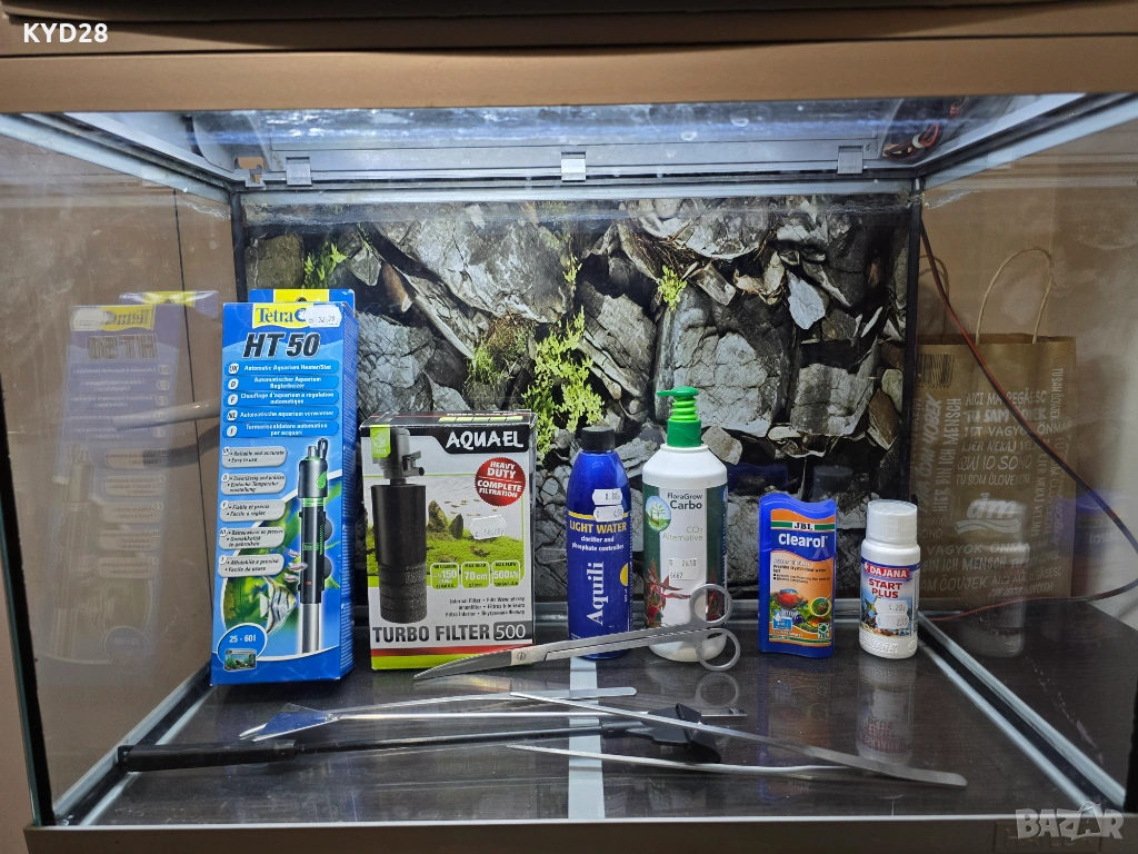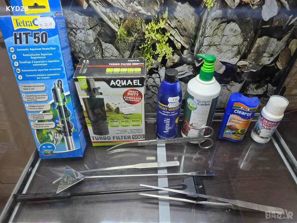 Продавам 60 литров аквариум с прилежащото му оборудване и аксесоари за стартиране на аквариум с растения и рибки. Осветлението е вградено в качака, като оригиналното е заменено с LED. Помпата е с гъба и керамична филтърна медия, позволяваща и биологична филтрация. В катп допълнение давам и ножици за подрязване на растенията, и другите принадлежности, които се виждат на снимките.