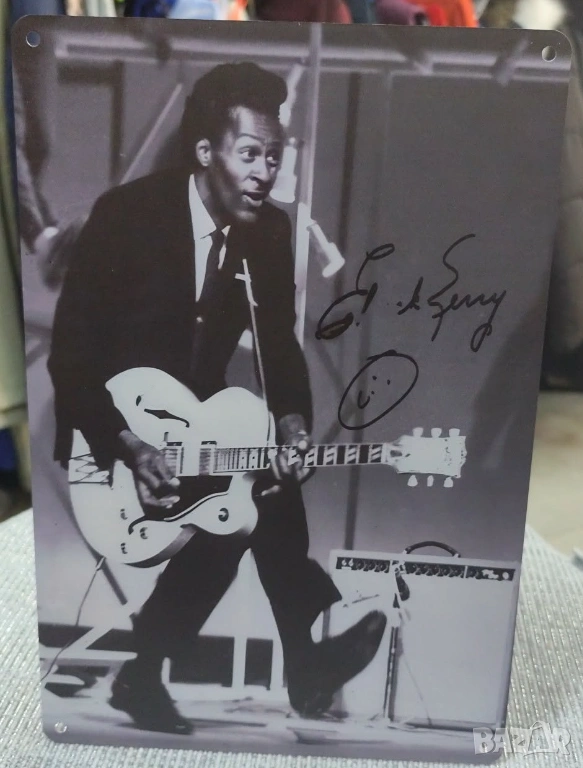 Това е една от тях,представяща метална табела(плакет),съвременна репродукция на Chuck Berry в типичната му позиция ..и с негов автограф