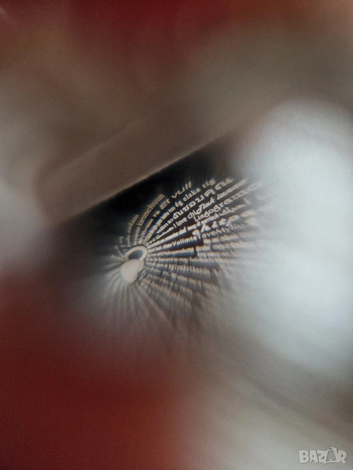 Изключително романтичен подарък, тъй като на пръв поглед камъкът в средата изглежда обикновен, но когато се приближиш може да видиш две преплетени сърца и посланието "обичам те" на различни езици.(опитах се да го снимам, на втората снимка)