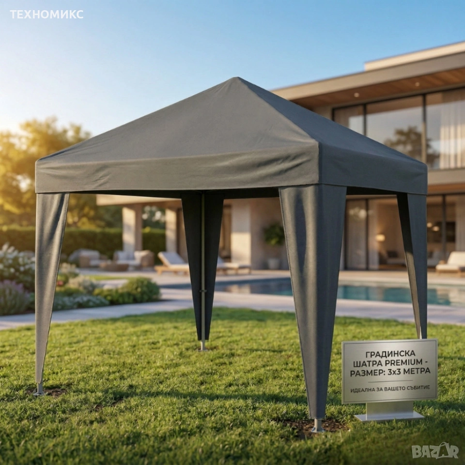 Сгъваема градинска шатра 3x3 м – Здрава метална конструкция, регулируема височина и защита