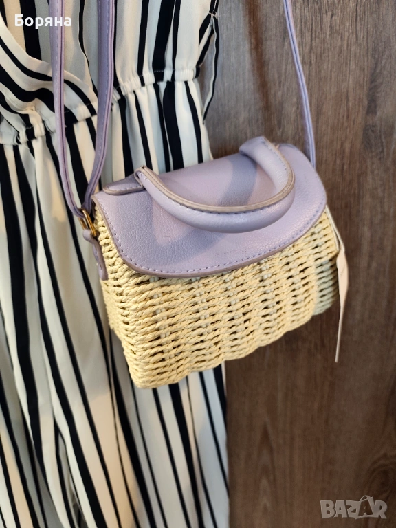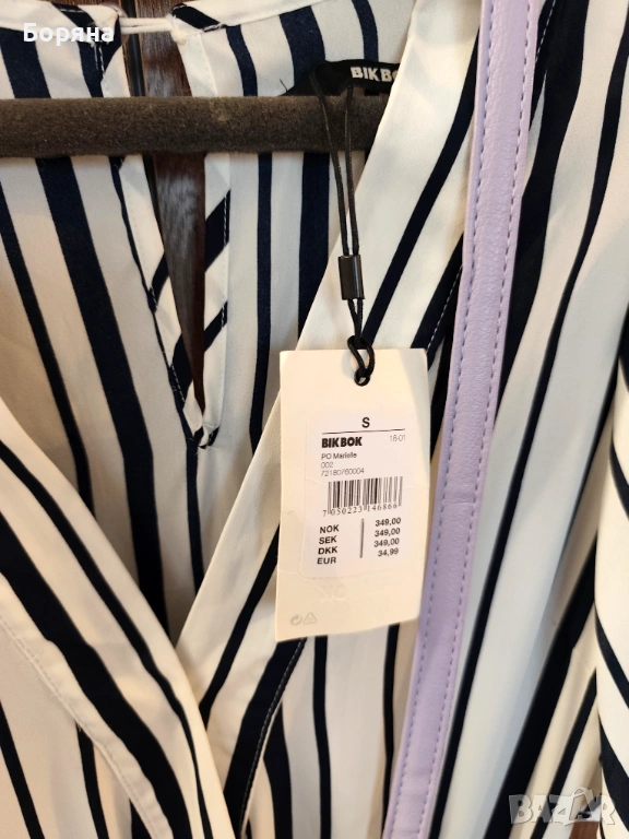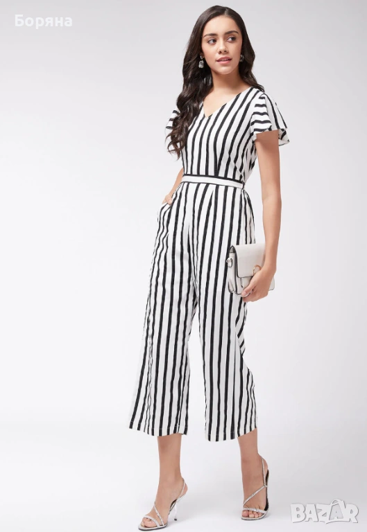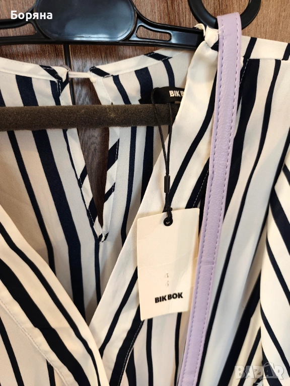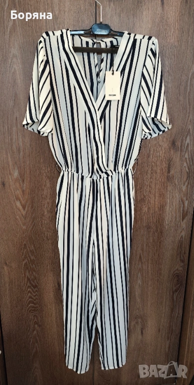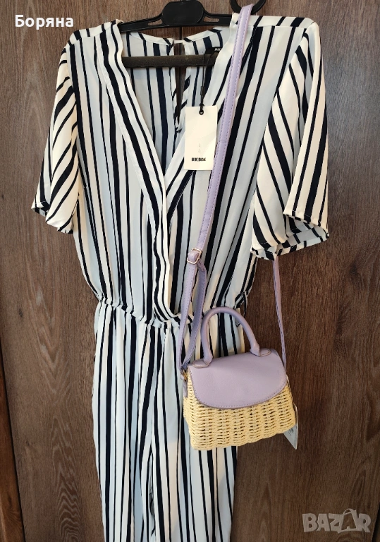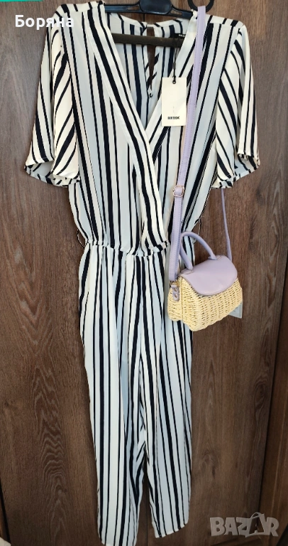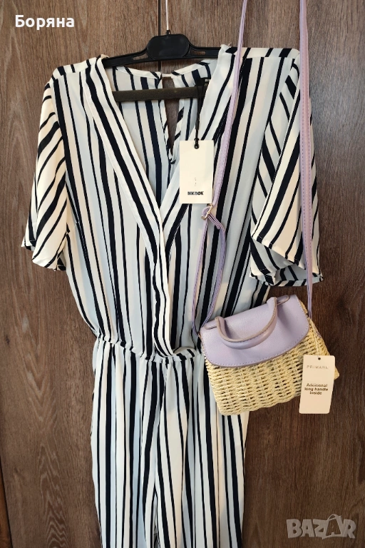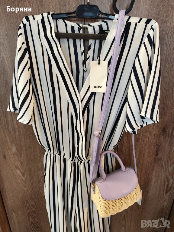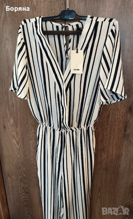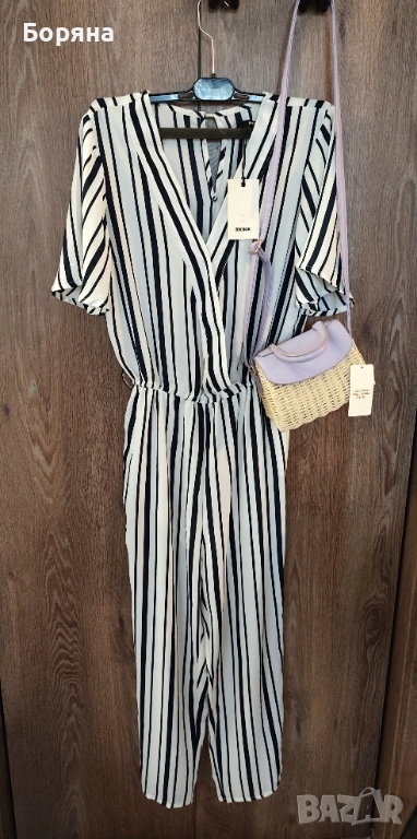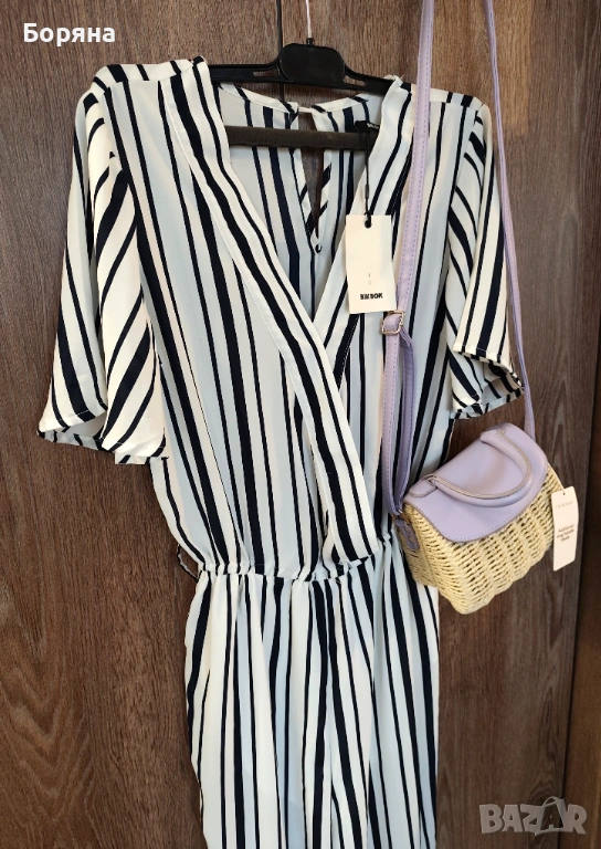 Нов с етикет летен гащеризон на Bik Bok, размер S, бяла основа на тънко вертикално синьо