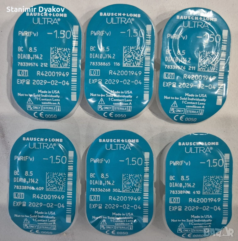 Продавам цяла опаковка(6 броя) от месечни контактни лещи Bausch + Lomb ULTRA. Лещита са с диоптър -1.50.