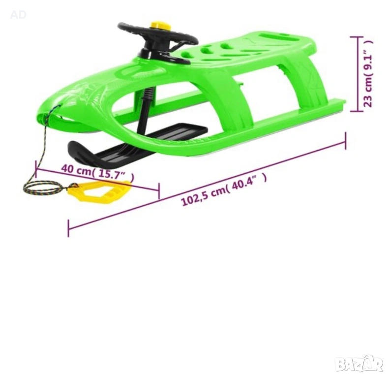 Въже за теглене: Прикрепено е въже за теглене, така че децата могат да бъдат теглени от възрастни по равна, заснежена повърхност или да се наслаждават на спускане по полегатите склонове.