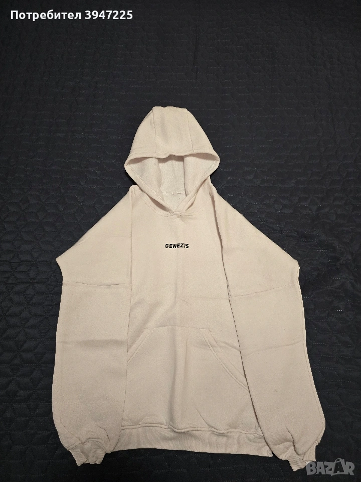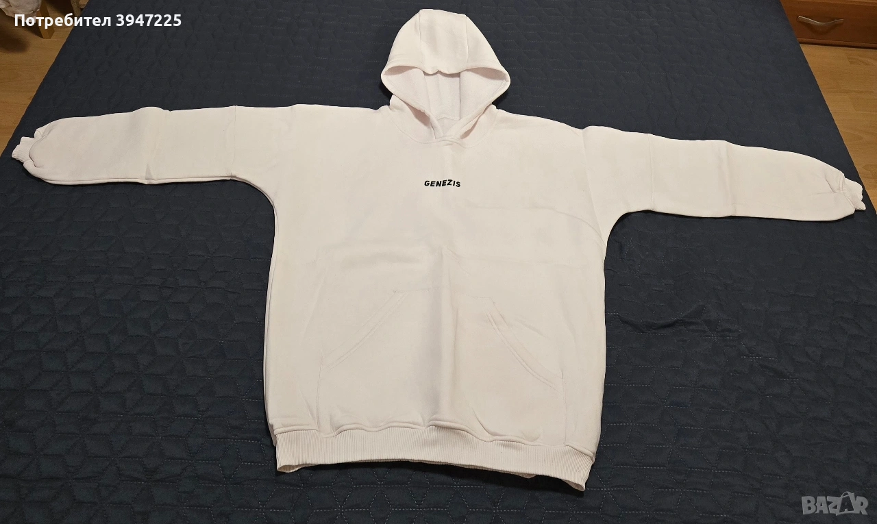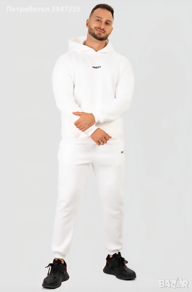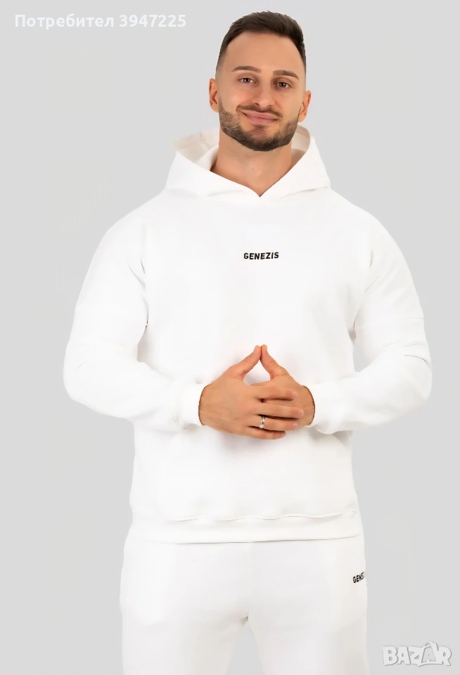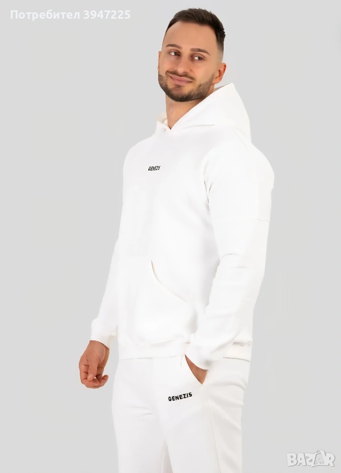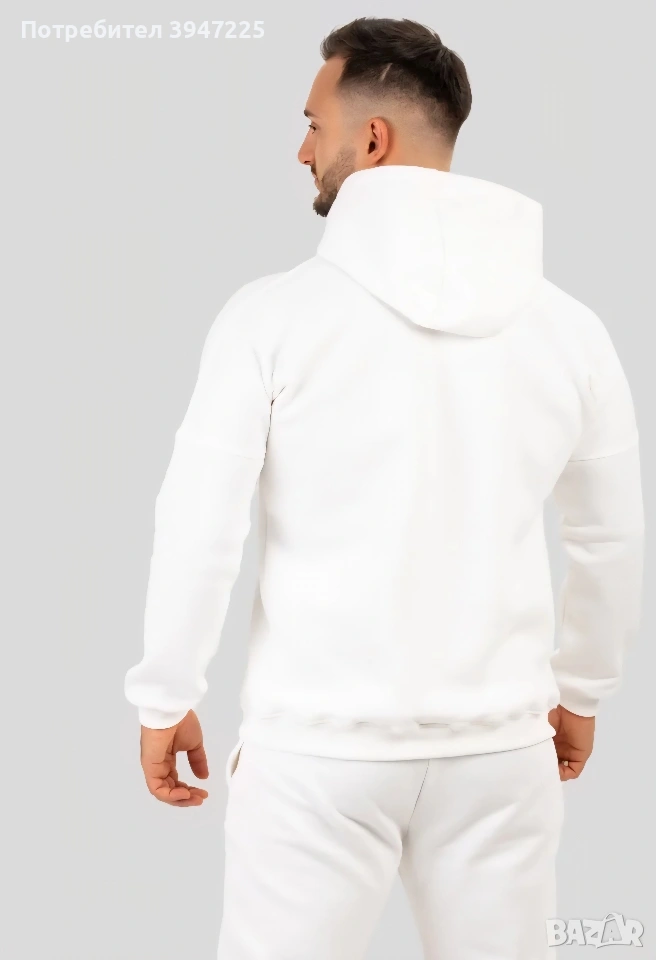 Продавам супер стилен мъжки екип в бяло – суичър с качулка + долнище. Стои уникално и привлича внимание веднага!