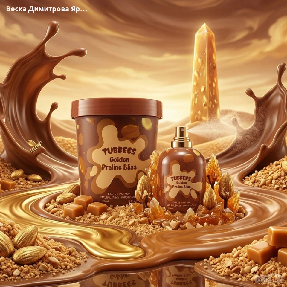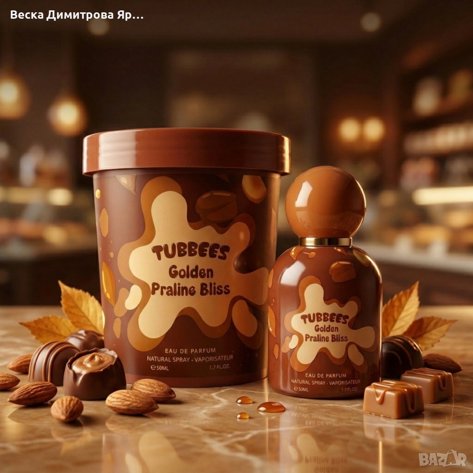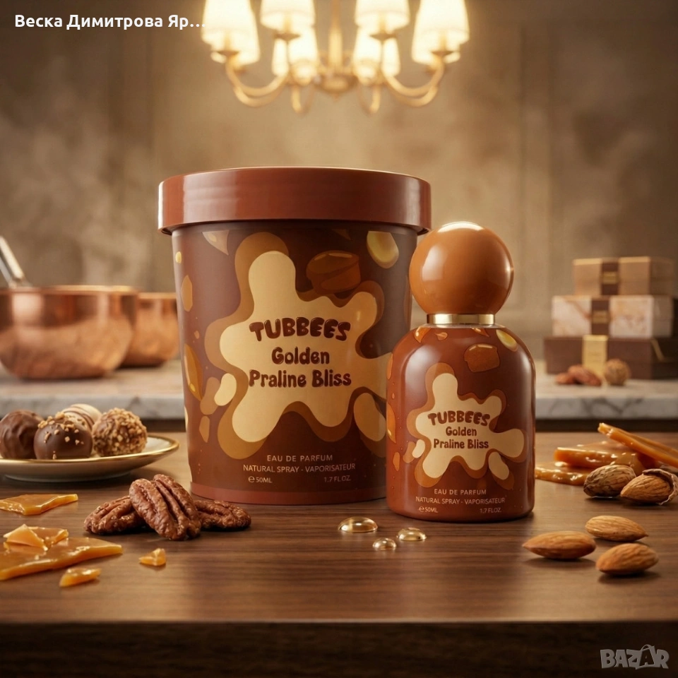 Марка: Tubbees Име на продукта: Golden Praline Bliss Тип аромат: гурме, сладък Концентрация: парфюмна вода (Eau de Parfum) Обем: 50 мл Връхни нотки: тръстикова захар, пралина, масло, мандарина, ядки Средни нотки: къпина, сметана, ванилия Базови нотки: пудрови тонове, тонка боб, ванилия Препоръчителна употреба: напръскайте от разстояние 15 cm върху пулсовите точки (китки, сгъвки на лактите, коленете)