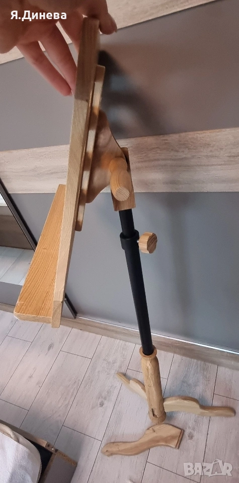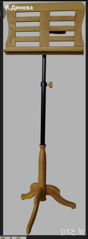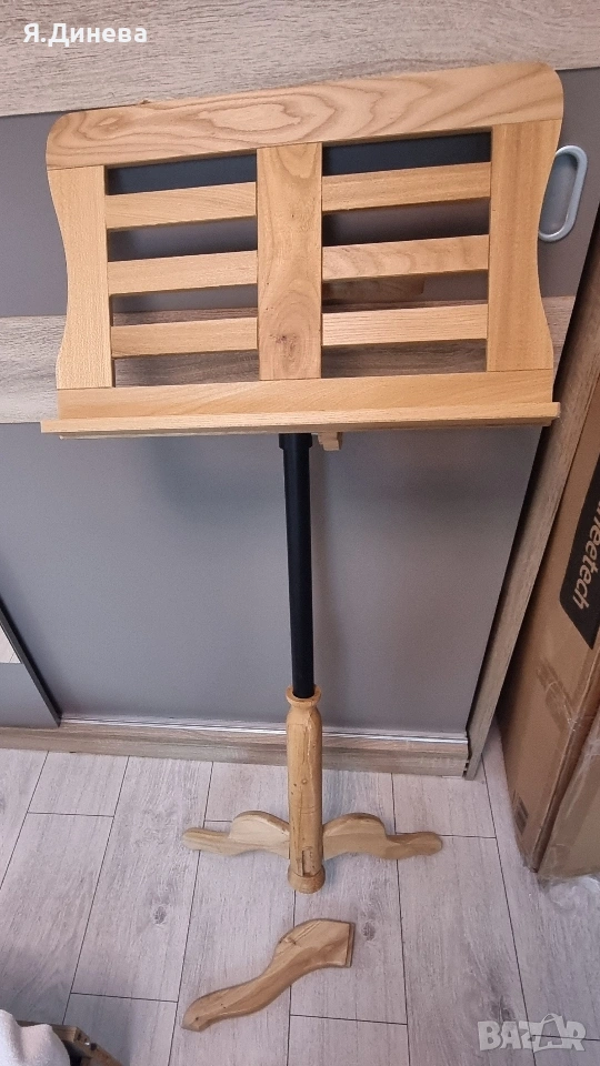Дървен стойка за ноти с регулируема височина. Изработена от здрава дървесина, подходяща за поставяне на партитури или ноти при музикални изпълнения. Практичен и удобен аксесоар за музиканти. Има дефект доло на едното краче Има счупено което е налично трябва да се залепи. Внос от Германия.
