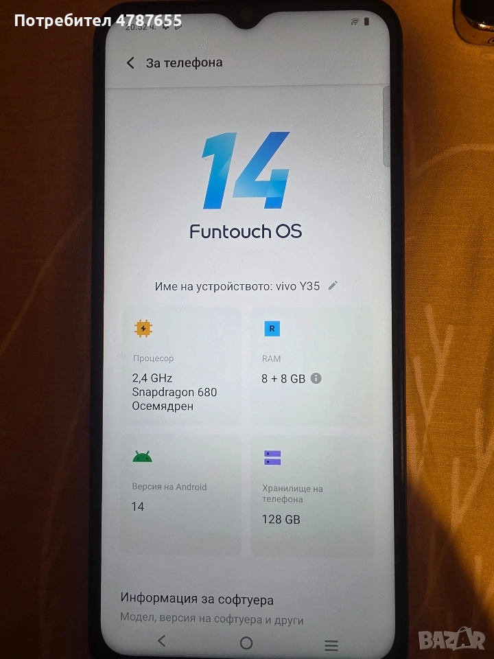 Продавам Vivo Y35 с вградена памет от 128GB и 8+8GB RAM. Устройството е в отлично състояние с нормални следи от употреба
