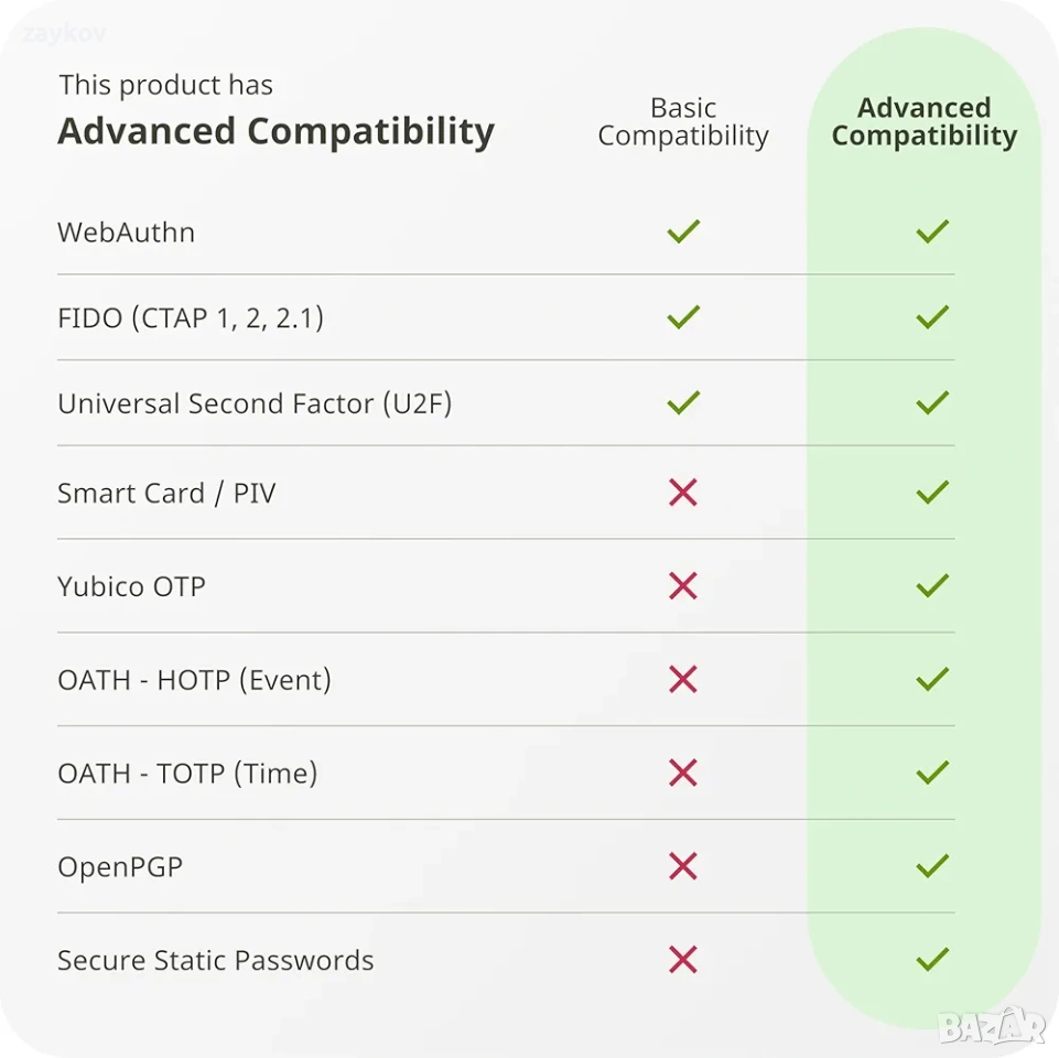 ГЪВЕРСАЛНА СЪВМЕСТИМОСТ: Поддържа се от акаунти в Google и Microsoft, мениджъри на пароли и стотици други популярни услуги. Поддържа множество протоколи за удостоверяване, включително FIDO2 (хардуерно свързан ключ за достъп), OATH-TOTP, смарт карта (PIV) и OpenPGP.