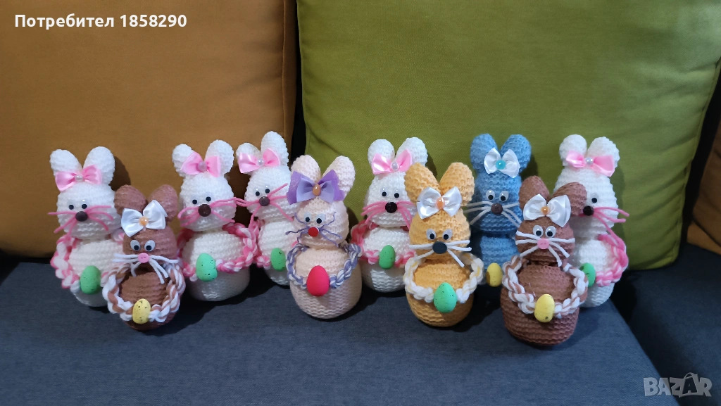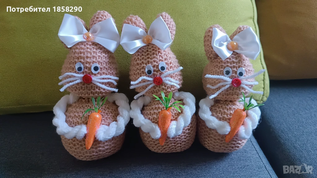 Очарователни плетени зайчета, изработени от мека прежда. Всяко зайче държи малко морковче или яйце , което придава допълнителен декоративен ефект. Перфектно допълнение за Великден или друг празник, което ще внесе уют и настроение във вашия дом.