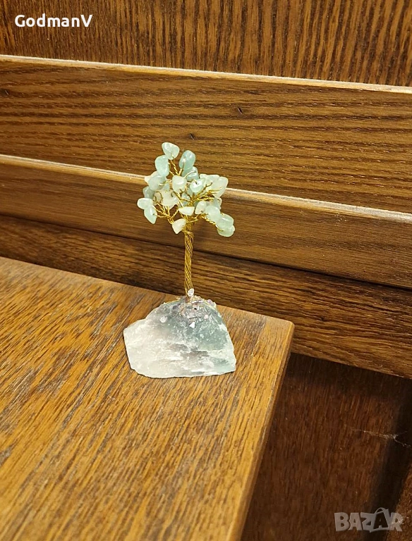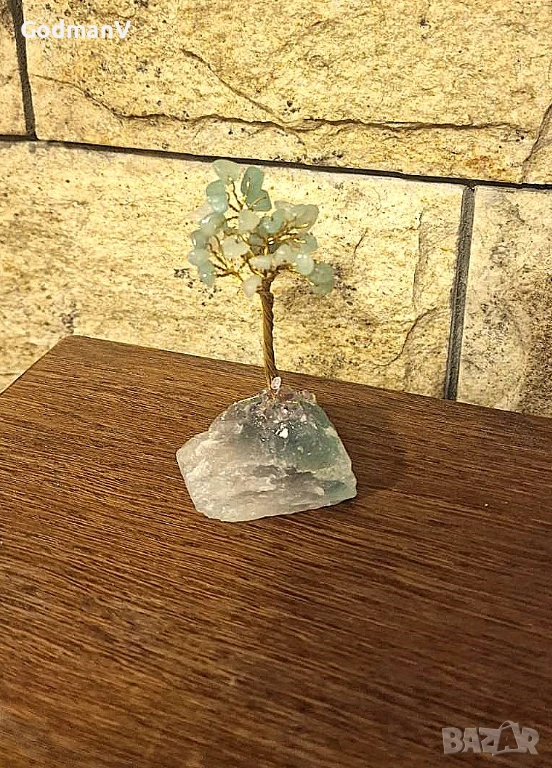 Дървото е закрепено със златна нишка върху основа от естествен флуорит с красиви преливащи нюанси. Благодарение на компактния си размер, то е прекрасен акцент за работното място, нощно шкафче или като талисман за дома.